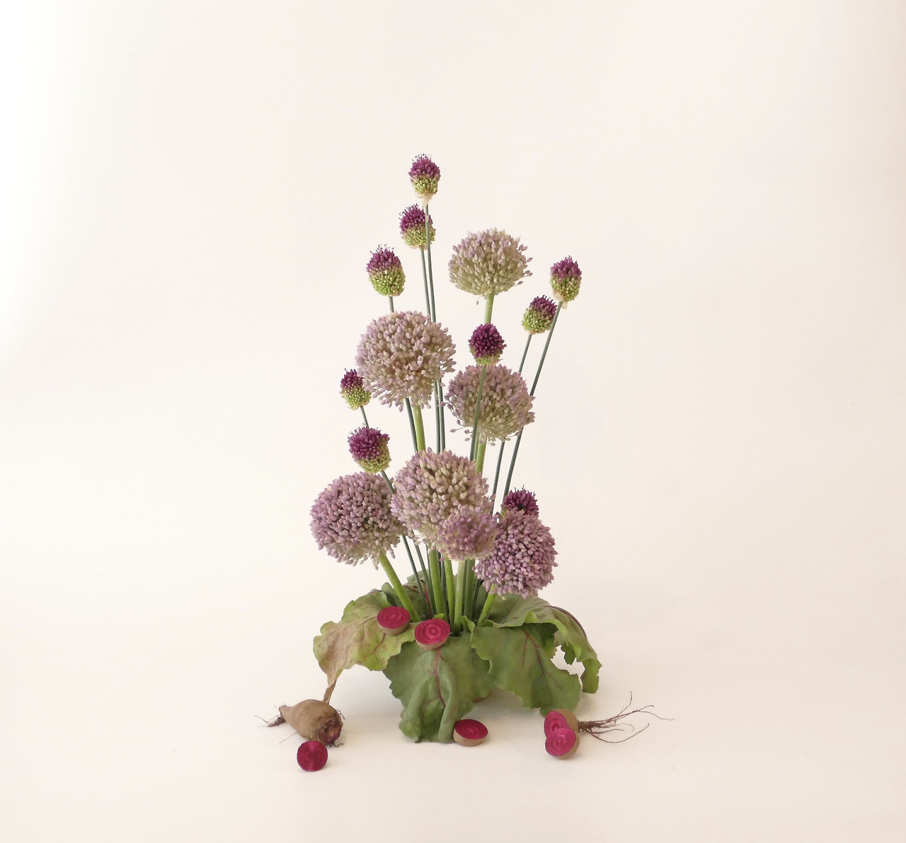 알륨과 드럼스틱이라는 파꽃 종류의 꽃들만 가지고 만든 침봉꽂이 작품이다. 줄기를 자를 때마다 파 향이 알싸하게 퍼지는데, 둥글고 큰 머리 때문에 형태를 잡을 때 너무 무거워 보이거나 쓰러질 듯 불안정해 보이지 않게 주의하며 만든다. 꽃을 꽂은 대접은 비트잎으로 덮어 가려주었고, 작은 비트는 단면이 보이게 잘라서 옆에 늘어놓아 장식을 했다. 꽃꽂이에 쓰려고 텃밭에서 기른 것이었는데 너무 아담하게 자라서 식품으로써의 상품가치는 떨어지지만 꽃작품에는 딱 쓰기 좋은(?) 사이즈였다. 본래의 용도로는 마이너스(-)였지만 나에게는 맞춤으로 플러스(+)가 됐달까?