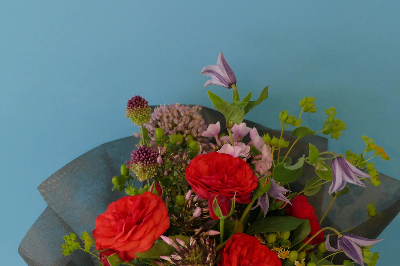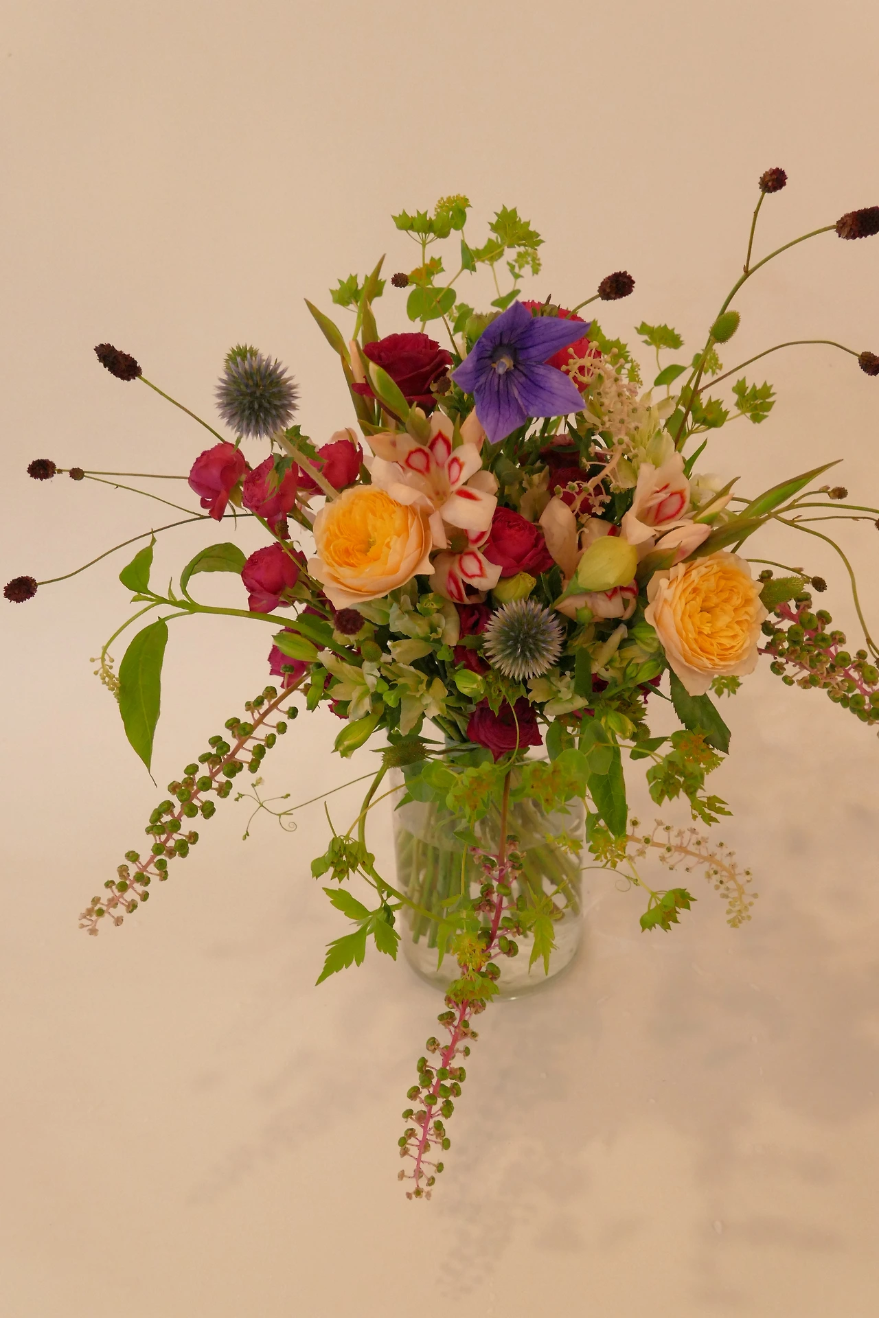 여자친구와의 기념일을 위해 주문한 손님의 꽃다발이었다. 올 여름의 기념일이 강렬하게 기억에 남을 수 있도록 여름의 강렬함을 가득 담았다. 특히 딱 이 시즌에만 나오기 때문에 언젠가 다른 곳에서 그 꽃을 보더라도 그날이 떠오를 수 있도록 형태가 특이한 꽃들도 함께 구성했다. 뾰족한 츕파츕스 같이 생긴 에키놉스, 선명한 보라색의 도라지꽃, 늘어진 형태가 우아한 미국자리공, 초콜렛시럽에 살짝 담궜다 뺀 것 같은 오이초, 수채화 붓으로 꽃잎을 터치한 것 같은 미니 글라디올라스, 주말농장에서 내가 직접 기른 풍선초 줄기까지. 무엇하나 눈길을 사로잡지 않는 것이 없다. 투머치하지만, 여름이니까 괜찮아 보인다.