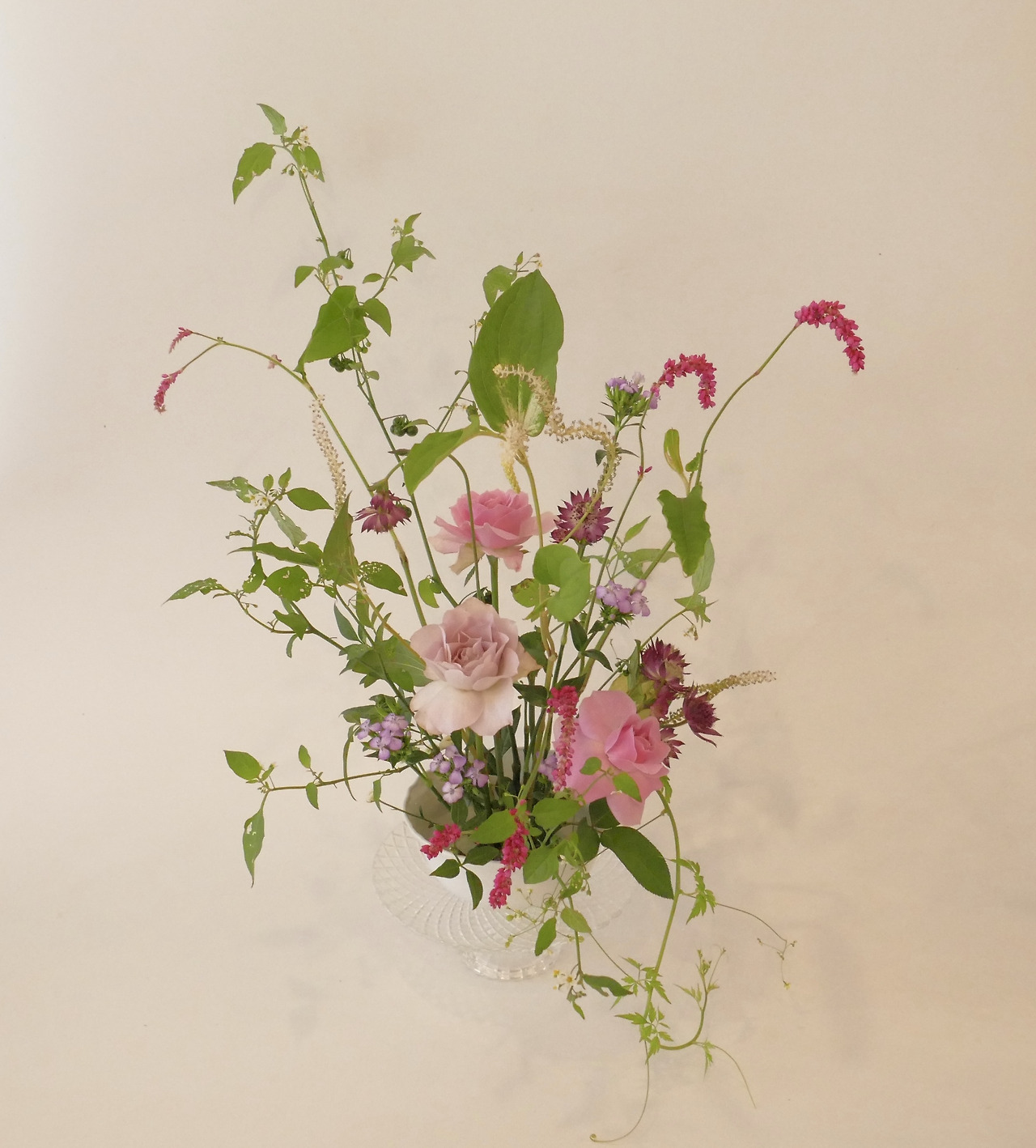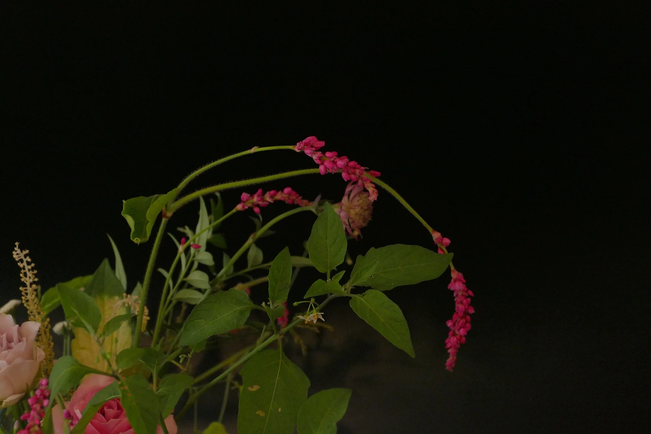 여뀌는 이름만큼이나 특이한 소재다. 주로 핑크, 혹은 핫핑크의 화려한 컬러를 가지고 있는데 줄기는 아주 가늘고 여리여리하다. 강아지풀의 컬러버전 같은 것이라고 생각하면 될 것 같다. 물론 강아지풀보다는 줄기가 유연한 곡선을 하고 있어서 무엇을 만들어도 그럴싸한 선이 되어 준다. 야생화에 해당하는 여뀌가 나오는 시즌은 아주 짧기 때문에 자주 꽃시장에 가는 편이 아니라면 만났을 때 집에 들여오는 것이 좋다. 다음번 만나는 건 다음해가 될지도 모를 일이다.