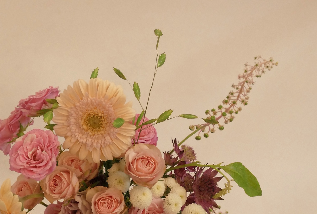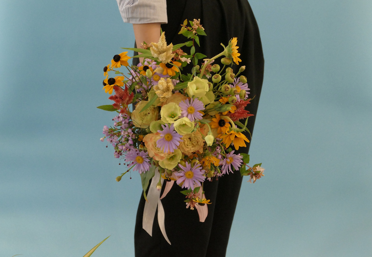 여름은 이렇데 다양한 꽃을, 이렇게 화려하게 컬러로 다 넣을 수 있는 유일한 계절이라고 생각한다. 크고 작은 꽃들, 그리고 꽃이 지고난 뒤 열매나 씨앗을 품은 소재들을 믹스할 수 있는 재미있는 계절이기도 하다. 적절히 그룹핑을 하여 꽃을 잡으면 많은 컬러를 사용해도 어지럽지 않게 조절할 수 있다. 그룹핑을 하면서도 뭉쳐져 보이지 않게 하는 건 높낮이의 조절로 해결한다. 꽃의 얼굴이 하나 하나 보인다면 더할 나위 없이 훌륭한 부케가 된다.
