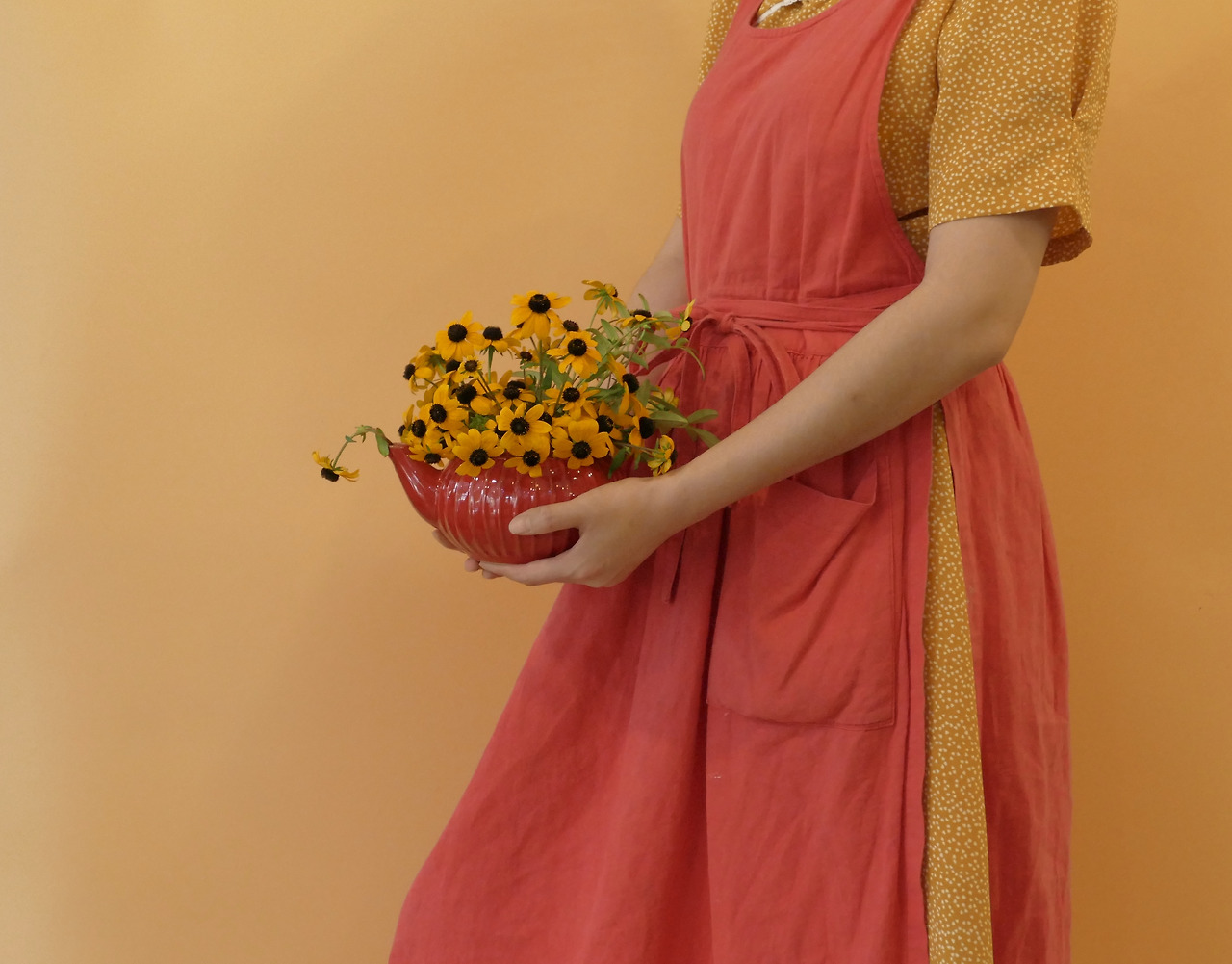 여러가지 종류의 꽃을 섞어서 사용할 수도 있지만 한 가지 종류만 써도 심심하지 않게 만들 수 있다. 다른 꽃과 함께 쓰면 다른 꽃을 시들게 할 수도 있는 루드베키아 한 종류만 써서 만들었다. 다이소에서 5천원에 산 이 빨간 주전자는 컬러가 강렬해서 안에 꽂는 꽃과 컬러의 대비를 주면 아주 심플한 디자인도 지루하지 않게 표현할 수 있어 좋아한다. 한가지 종류의 꽃만 사용할 때 가장 중요한 점은 꽃이 하나의 덩어리로 뭉쳐져 보이지 않게 표현하는 것이다.