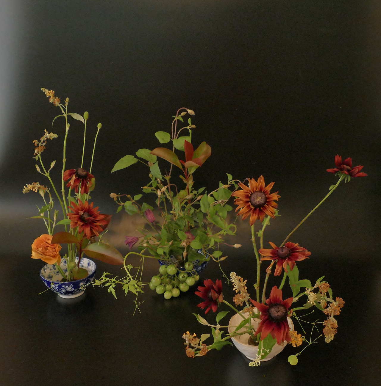 주말농장에서 데려온 벌레먹은 잎사귀가 달린 까마중과 풍선초 줄기에, 여뀌, 삼백초, 석죽 같이 컬러는 화려하지만 야생화의 수수함이 느껴지는 꽃들을 함께 썼다. '화려하지만 수수하게'라는 모순적인 말도 꽃에는 통한다. 높고 낮은 전체적인 밸런스를 고려하며 만들었다. 국그릇에 침봉 꽂이로 완성했다.