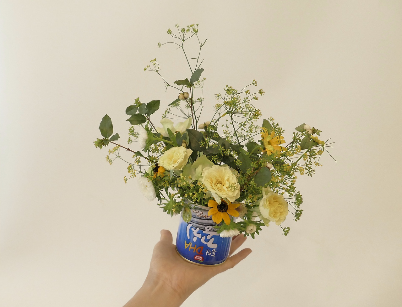 통조림 꽁치로 김치찌개를 만들고나서 분리수거를 하다가 갑자기 이 통이 예뻐보였다. 빨간 캠벨스프 캔은 사람들이 예쁘다고 모으거나 캔이 그려진 그림을 사기도 하는데 이 파란 꽁치캔이 그보다 못할 건 또 뭔가 싶었다. 내가 한글을 읽을 줄 몰랐다면 이 캔을 캠벨스프 캔처럼 예쁘다 생각할지도 모를 일이다. 그래서 꽃을 꽂았다. 캔이 파란색이니 노란 꽃들을 꽂으면 프레시한 느낌이 살 것 같았다. 깨끗하게 씻은 통조림캔에 참시호, 루드베키아, 노란 마가렛, 화이트베리, 스프레이 로즈를 꽂아 완성했다. 이걸 만들기 위해 꽃을 따로 준비했다기 보다 꽃을 다듬다가 나온 짧은 꽃가지들을 버리지 않고 모아 두었다가 노란 꽃들만 따로 사용했다. 높이가 낮고 입구가 넓지 않은 화기는 이런 자잘한 꽃들을 꽃아놓기가 좋다.