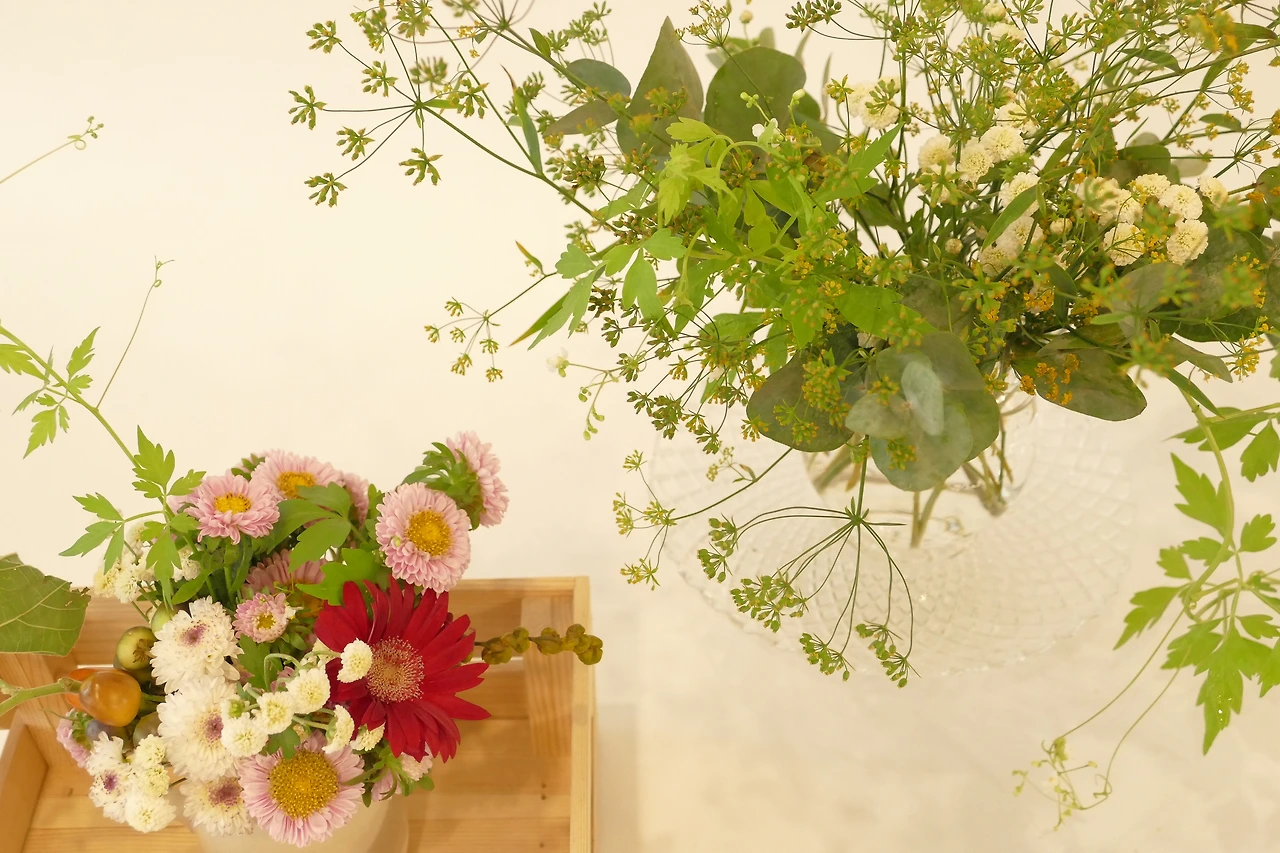나는 가늘고 섬세한 참시호의 가지와 선이 잘 보이도록 작은 이파리들은 제거하고 꽃꽂이나 꽃다발을 만드는 편이다. 종종 수업시간에 '이 꽃은 어떻게 다듬어야 하나요?' '잎은 다 떼야 하나요? 얼마나 남겨두어야 하나요?' 라는 질문을 받을 때가 있다. 나의 답은 '원하는 대로 하세요.'이다. 그 잎이 붙어 있는 것이 더 예쁘다면 그대로 두고, 떼어내는 것이 더 예쁘다면 떼어내는 것이 답이다. '언제나', '항상', '반드시' 그래야 하는 법은 없다고 생각한다. 세상도 변하고, 그에 따라 법과 도덕, 옳다고 판단되는 진리도 달라지는데 꽃을 하는데 있어 절대적인 규칙이 있을리 없다. 꽃의 세계에서 언제나 정답인 것은 '예쁨' 뿐이다. 예뻐 보이는 것이라면 그 무엇이든 정답이 될 수 있다.