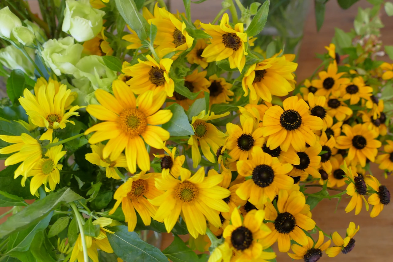 루드베키아는 진물까지는 아니지만 줄기끝을 잘라 물에 담그면 금방 물을 뿌옇게 만드는 액체를 흘리는 꽃인데 이렇게 물을 탁하게 만드는 꽃들은 다른 꽃들과 함께 꽃아두면 다른 꽃을 시들게 한다고 한다. 수선화도 그런 꽃들 중 하나이다. 그럼 다른 꽃과 함께 어우러지게 꽂아두고 싶으면 어떻게 해야 하느냐, 하면 원하는 길이로 잘라 미리 다른 물통에 넣어두었다가 사용하는 것을 권한다. 하지만 꽃을 만들다 보면 원하는 길이로 미리 잘라 놓는다는 건 불가능에 가깝다. 이걸 짧게 쓸지 길게 쓸지는 써 봐야 하는 것이다. 그렇기 때문에 루드베키아를 쓸 때는 물을 다른 꽃들을 쓸 때보다 더 자주 갈아주는 것을 권한다.