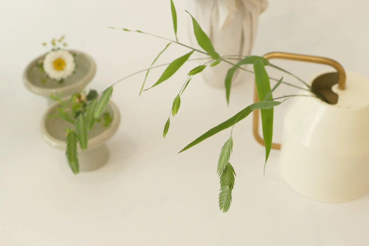 보리사초도 이 시즌에 흔히 볼 수 있는 소재 중 하나다. 위에 소개한 여뀌나 참시호 보다는 시즌이 길기 때문에 너무 다급히 구하지 않아도 된다. 다만 초여름의 보라사초와 한 여름, 늦 여름의 보리사초는 때깔이 좀 다르다. 이른 계절의 식물들은 어린이, 청소년처럼 연약하고 색도 노란빛이 섞인 연두색이지만 제철, 특히 햇빛을 충분히 받고 거친 기후 속에 살아난 식물들은 조금 더 어두운 초록색을 띈다. 줄기도 좀 더 튼튼해지고 크기도 좀 더 커진다. 어떨땐 아주 튼튼하고 확실한 존재감을 가진 것들보다 연약하고 여리여리한 선과 소재가 필요할 때도 있기 때문에 그때 그때 용도에 맞게 사용하는 것이 좋다.