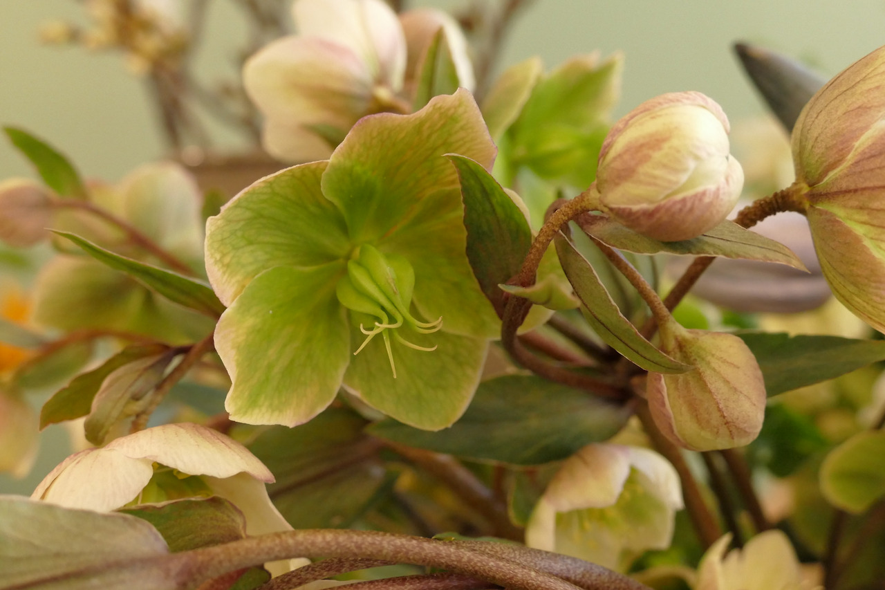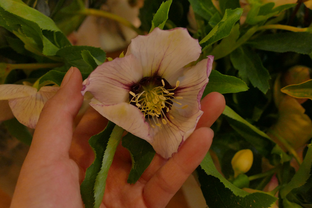 섬세한 생김에 단단한 꽃의 얼굴도 좋지만 내가 헬레보루스를 좋아하는 이유 중 또 하나는 유연한 가지에 있다. 통통한 헬레보루스의 갈색 가지는 나무처럼 단단해 보이지만 어떻게 휘어도 쉽게 부러지지 않을만큼 유연하다. 꽃다발을 만들다보면 가지가 약한 꽃들은 한 두송이 쯤 꺽이기 마련인데 헬레보루스는 다소 거칠게 다루어도 꺽이거나 상처가 나지 않는다. 거친 계절을 제철로 둔 꽃답게 물에 넣지 않고 몇시간 있어도 쉽게 시들지 않는다.