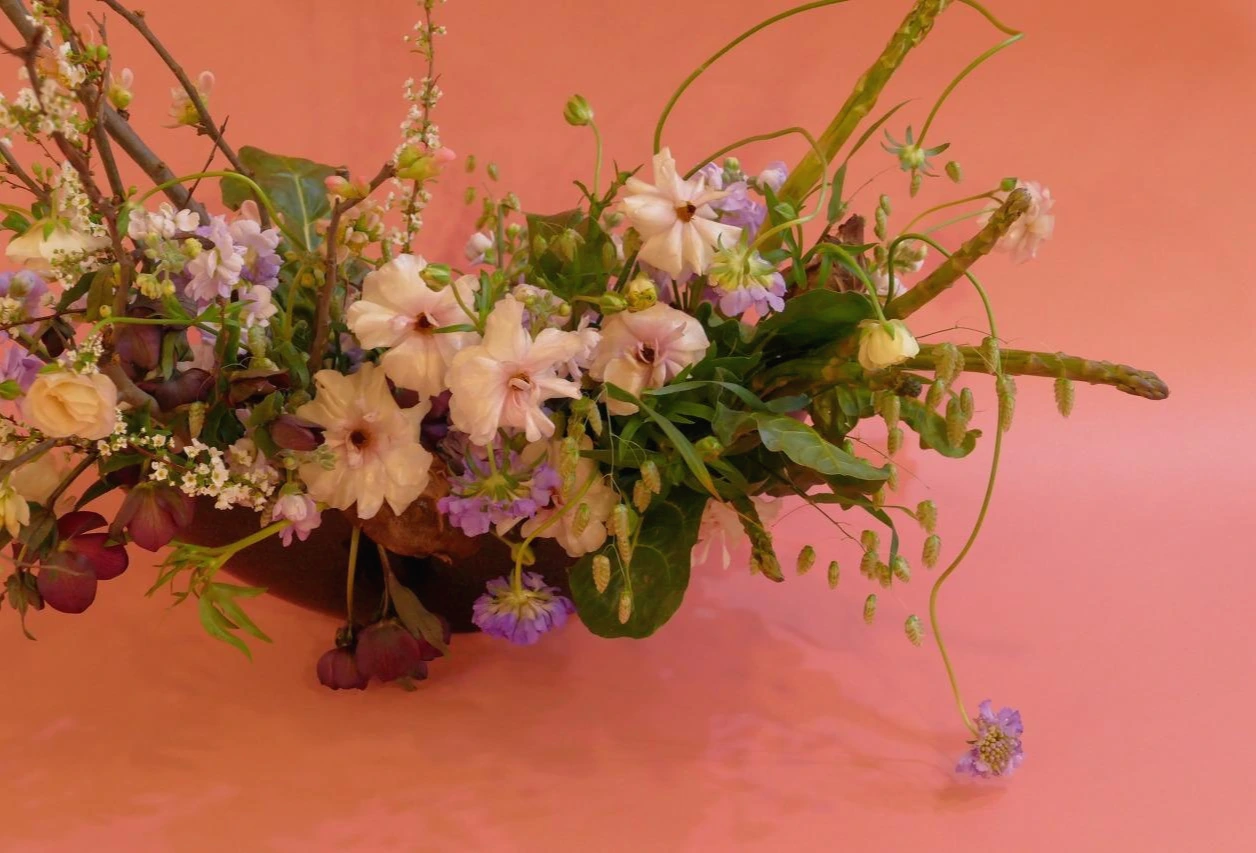 꽃이 아니라 채소들에 관심이 생겨 만들어 본 어레인지먼트였다. 아스파라거스와 근대를 마트 알뜰코너에서 발견했는데 왠지 너무 예뻐보였다. 그들의 싱그러움과 튼튼함은 꽃이 가진 섬세함과 예민함, 날카로운 아름다움과는 또 다른 매력이 있다는 생각이 들었다. 꽃은 원래 무성한 잎이 나야 필 수 있는 것이고, 꽃이 피는 이유는 열매를 맺기 위함이니 그것이 먹을 수 있는 것이든 아니든 그 과정에 있는 다른 것들과 함께 어우러지는 게 어색할리 없다는 생각이 들어 화사한 봄꽃들에 함께 장식해 주었는데, 어색하지 않았다.