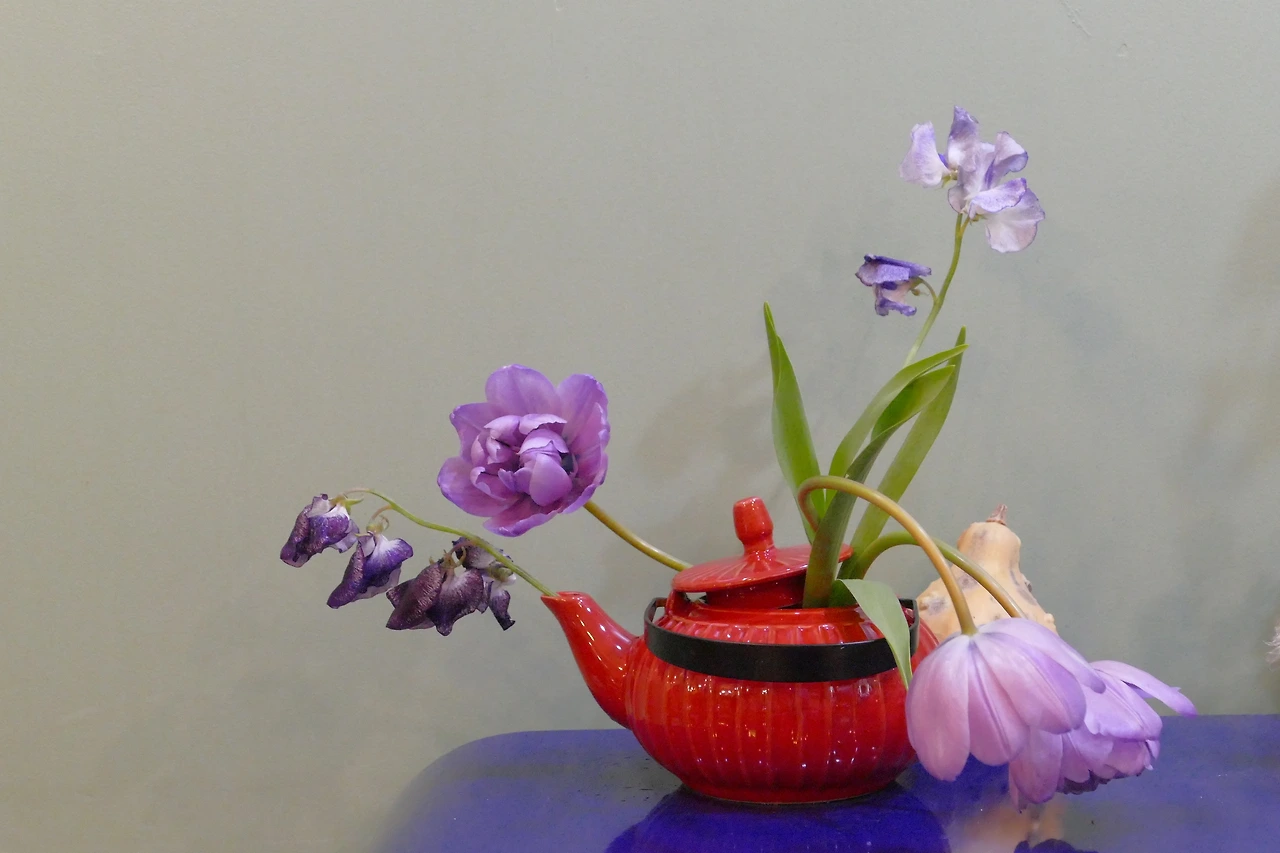 어딘가 다른 작품을 만들 때 썼던 튤립과 스위트피가 아직은 좀 더 볼 수 있을것 같아 따로 꽂아주었다. 새빨간 티팟은 5천원을 주고 산 싸구려인데 컬러가 매우 강렬해서 적은 양의 꽃을 임팩트있게 표현하고 싶을 때 사용한다. 이미 시간이 많이 지나서 키가 훌쩍 자란(튤립은 물에 꽂아두면 길이가 길어진다) 튤립은 줄기가 매우 휘청거리는 편이다. 휘청이는 그 모양 자체가 나쁘지 않아 꽃의 얼굴이 바닥을 향하게 그냥 두었다. 어떨 때의 꽃은 얼굴이 아니라 줄기를 보는 재미를 준다. 그 매력을 발견하는 건 꽃을 세밀히 관찰하는 나의 몫이다.