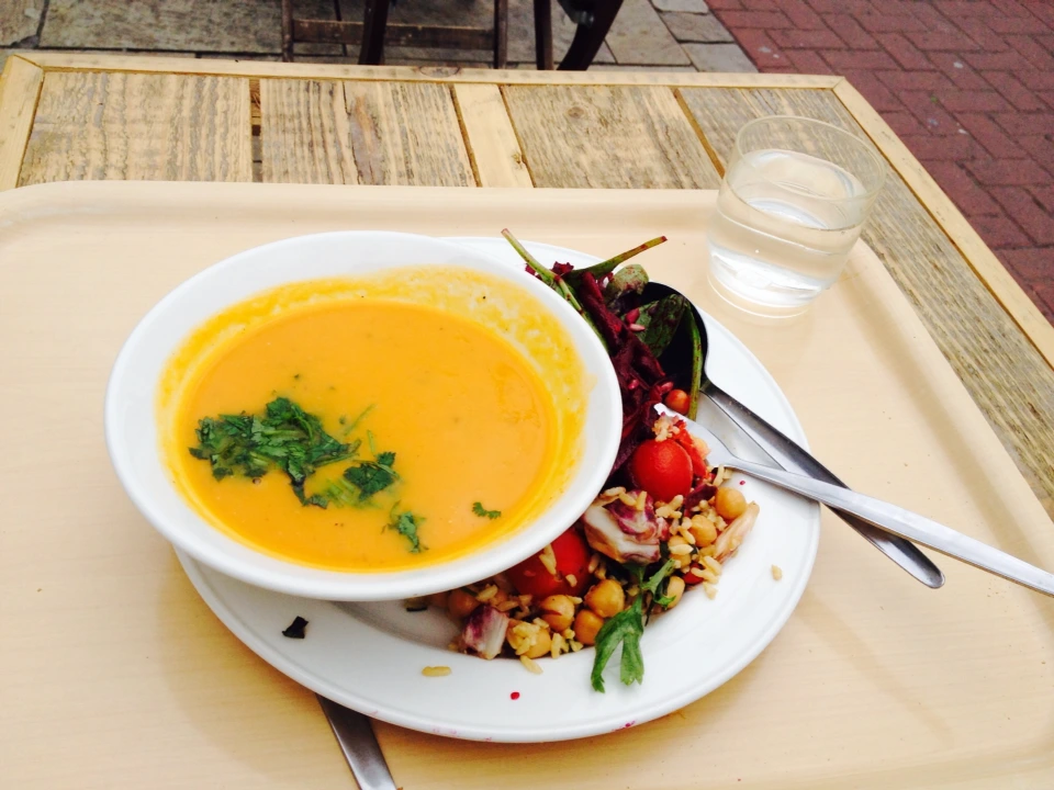 바람은 쌀쌀했지만 오늘은 바깥 테이블에 앉았다. 따뜻한 고구마스프에서는 코코넛향이 났다. 병아리콩과 현미를 섞어 만든 고소한 샐러드와 비트루트(빨간무)와 배가 들어 달콤하면서도 시원한 샐러드 두 가지를 남김 없이 비워내고는, 후식으로 커피를 홀짝이며 또 하나의 기억을 떠올렸다.