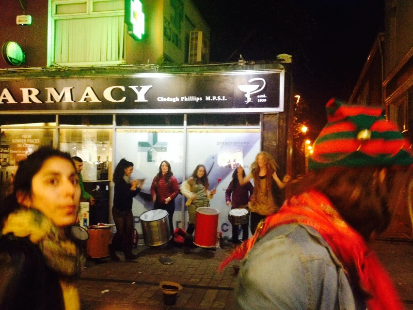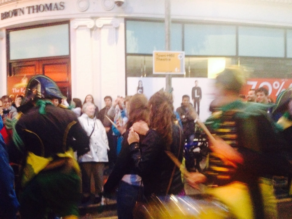 둘째날 큰 기대를 안고 간 모노연극 <Match Box>는 작품성으로는 의심할 여지 없이 훌륭했으나, 2시간 가까이 쉬지 않고 이어지는 여배우의 독백을 따라가는 것이 아직도 내 영어실력으로는 쉽지 않다는 아픈 깨달음과 함께 절반의 아쉬움으로 남았다. 언제쯤 내가 좋아하는 연극과 영화를 한국말처럼 이해하며 볼 수 있게 될런지. 속상한 마음에 숙소에 돌아와 일찍 자려고 침대에 누웠는데, 창밖에서 들려오는 오페라 사운드와 사람들의 웅성거림이 심상치 않았다. 앗, 밤 10시부터 시작한다는 <The Giant Divas>의 퍼레이드가 지나가고 있는 게 분명했다. 그래, 그래도 골웨이 여행의 마지막 밤인데 지금 잠들긴 아깝지! 벌떡 침대에서 일어나 다시 옷을 주섬주섬 걸쳐 입고 거리로 나갔다. 퍼레이드는 바로 내 호스텔과 맞닿은 거리를 지나고 있었다. 거대한 드레스를 입고 광대처럼 흰 마스크 분장을 한 배우들이 부르는 오페라곡의 멜로디가 차가운 밤공기를 뚫고 골웨이 타운 골목골목에 울려 퍼졌다. 퍼레이드가 지나간 자리에는 다양한 거리뮤지션들이 저마다의 음악으로 축제의 열기를 이어나갔다. 젊은 히피들 네다섯 명이 북을 치며 탭댄스를 추기 시작하자 사람들도 하나 둘 리듬에 맞춰 몸을 흔들기 시작했고 어느새 거리 전체가 댄스장이 되었다. 다시 빗방울이 떨어지기 시작했지만, 자유로운 영혼들의 춤의 향연은 끝날 줄을 몰랐다.
