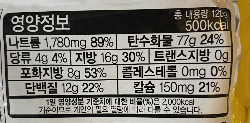 영양정보에는 해당 제품의 영양소별 함유량과 1일 영양성분 기준치에 대한 비율이 표시되어 있다. 처음에는 표를 보면서 충격을 받았다.