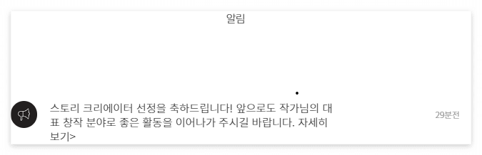 오늘 점심을 먹고 있는데 브런치 스토리 알람이 울려 들여다봤더니 '스토리 크리에이터'로 선정이 되었다는 기분 좋은 소식이 도착해 있었습니다.