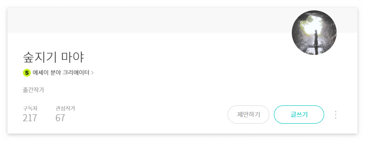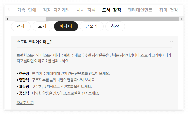 브런치 스토리에서는 꾸준히 창작활동을 하는 작가들에게 각 분야의 크리에이터로 선정을 해 주고 있는데, 저는 에세이 분야 크리에이터로 선정이 되었어요.