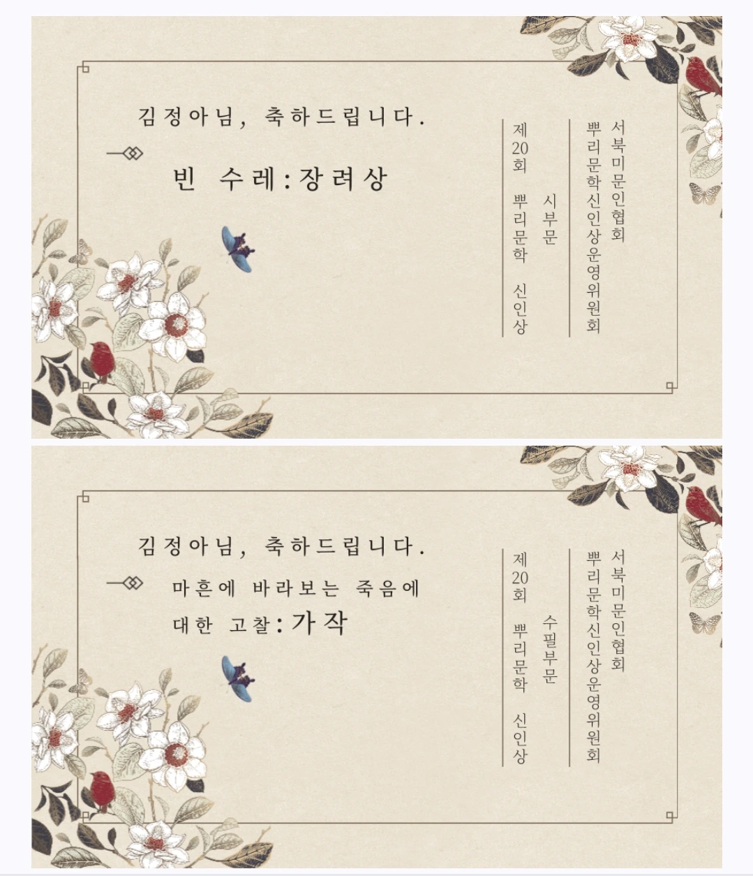 그동안 브런치에 기재해 왔었던 글들 중 수필과 시를 뽑아서 공모했고 오늘 아침 예상치도 못한 수상의 영광을 안게 되었다.