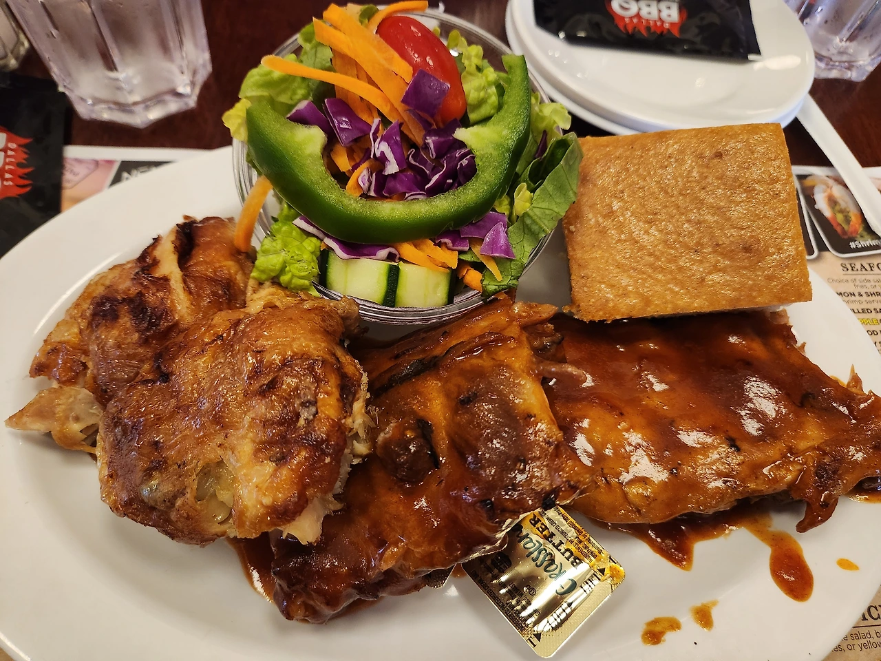우리는 바비큐 립과 치킨 콤보를 주문했고 사이드로 이곳에서 직접 만든 콘브래드와 샐러드가 함께 나왔다.