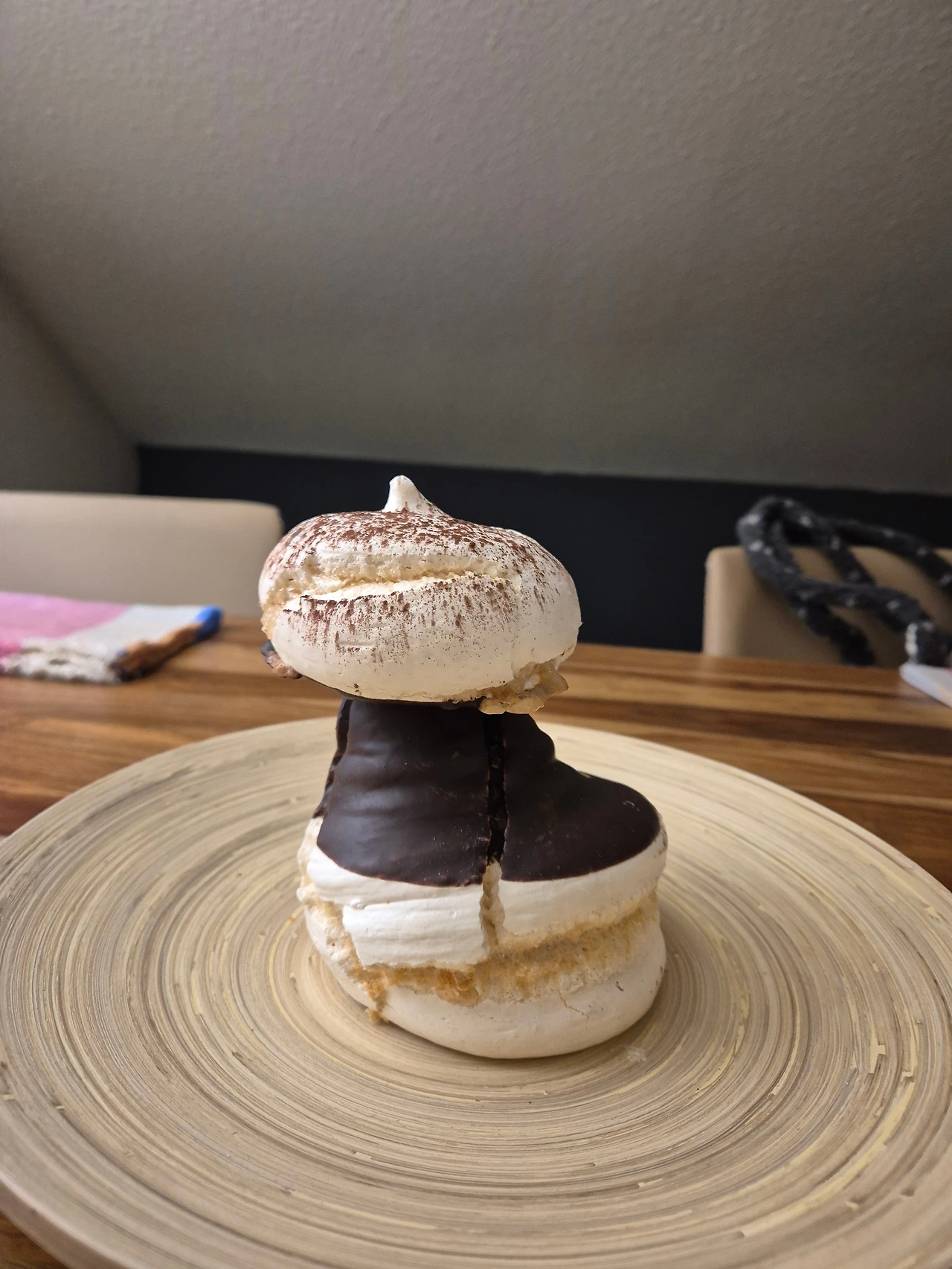 두 개의 큰 머랭 사이에 달콤한 크림이 채워져 있도 겉면은 초코릿으로 코팅, 코코아 가루가 뿌려져 있다.