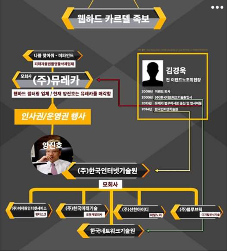 한사성 등은 김경욱이 2009년 한국네트워크기술원에 입사, 2013년에는 뮤레카의 법무이사가 되었으며 언론과 법조계 정치권에 뻗어있는 인맥 등을 이용해 웹하드의 불법성을 보호해왔다고 주장했다.