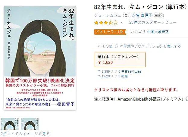 “학생시절, 중국과 한국에서 유학한 언니(누나?)에게 들은 이야기(10여 년 전에 들었다고). ‘한국남자들은 일본 여성이 참하고 순종적이라고 생각해. 일본 여성과 사귀고 싶어하는 한국 남자들은 남존여비의 생각이 강해. 국제결혼 할거면 가사분담이 당연한 중국남자가 차라리 낫지’ 당시에는 그냥 그렇구나, 하고 넘겼는데 [82년생김지연]의 아마존 리뷰를 읽고 그 이야기가 다시 떠올랐다. 한국 남성으로 추정되는 이들의 별점테러. 그들의 뿌리깊은 여성혐오, 그리고 굳이 일본어로 리뷰까지 쓸 만큼 ‘일본 여성’에 대한 환상을 엿보여서 놀랐다.”