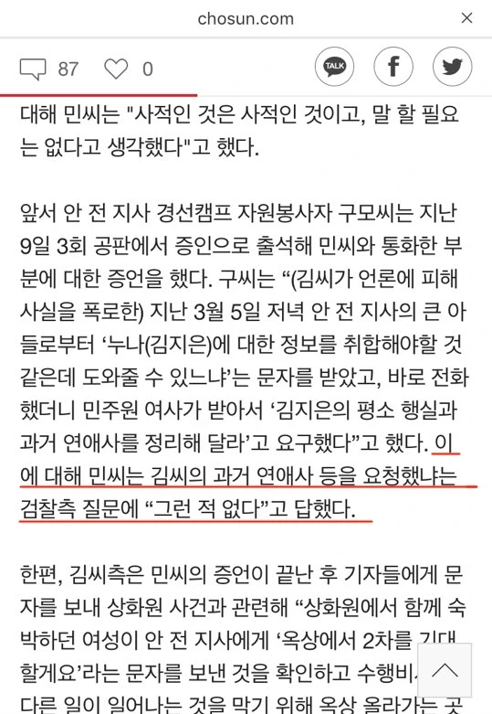 2018년 3월 5일, 김지은 씨의 뉴스룸 출연 직후에 지지자 몇과 모여 울다가 화내다가 술을 마시고 있을 때 또 다른 지지자로부터 “민 여사님이랑 통화했는데 김지은 씨의 남자관계를 조사해 달라고 하더라.”라는 내용의 연락을 받기 전까지는.. 우리는 그렇게 한 여성의 명예와 상처를 진심으로 염려하고 있었다.