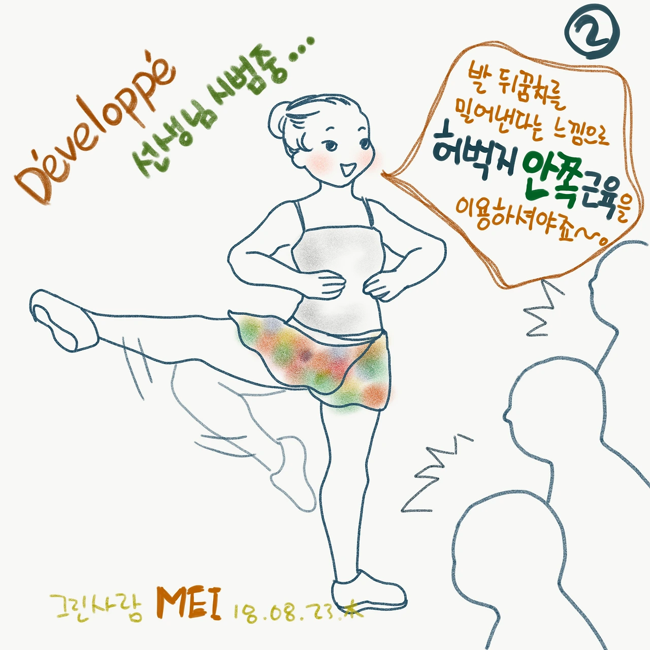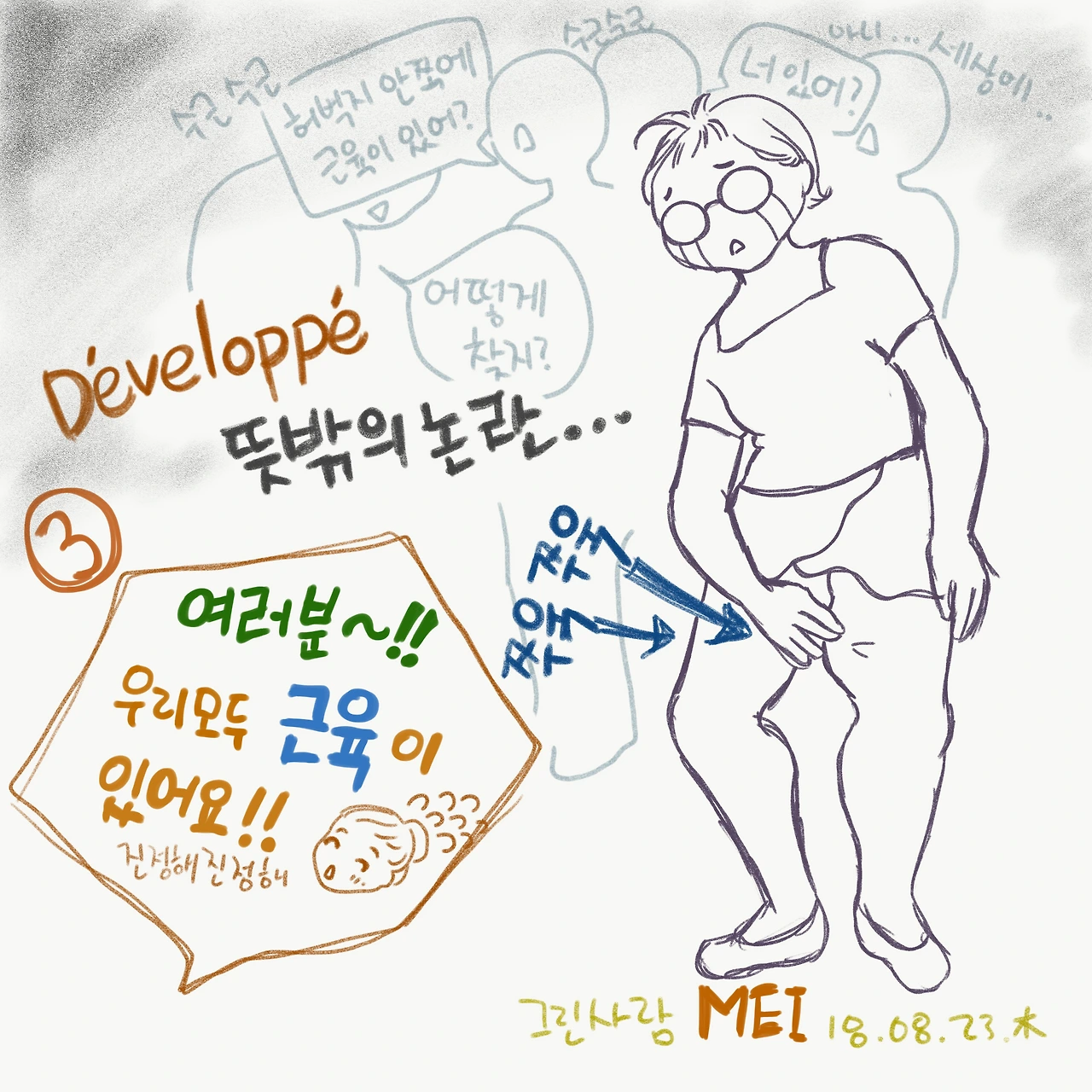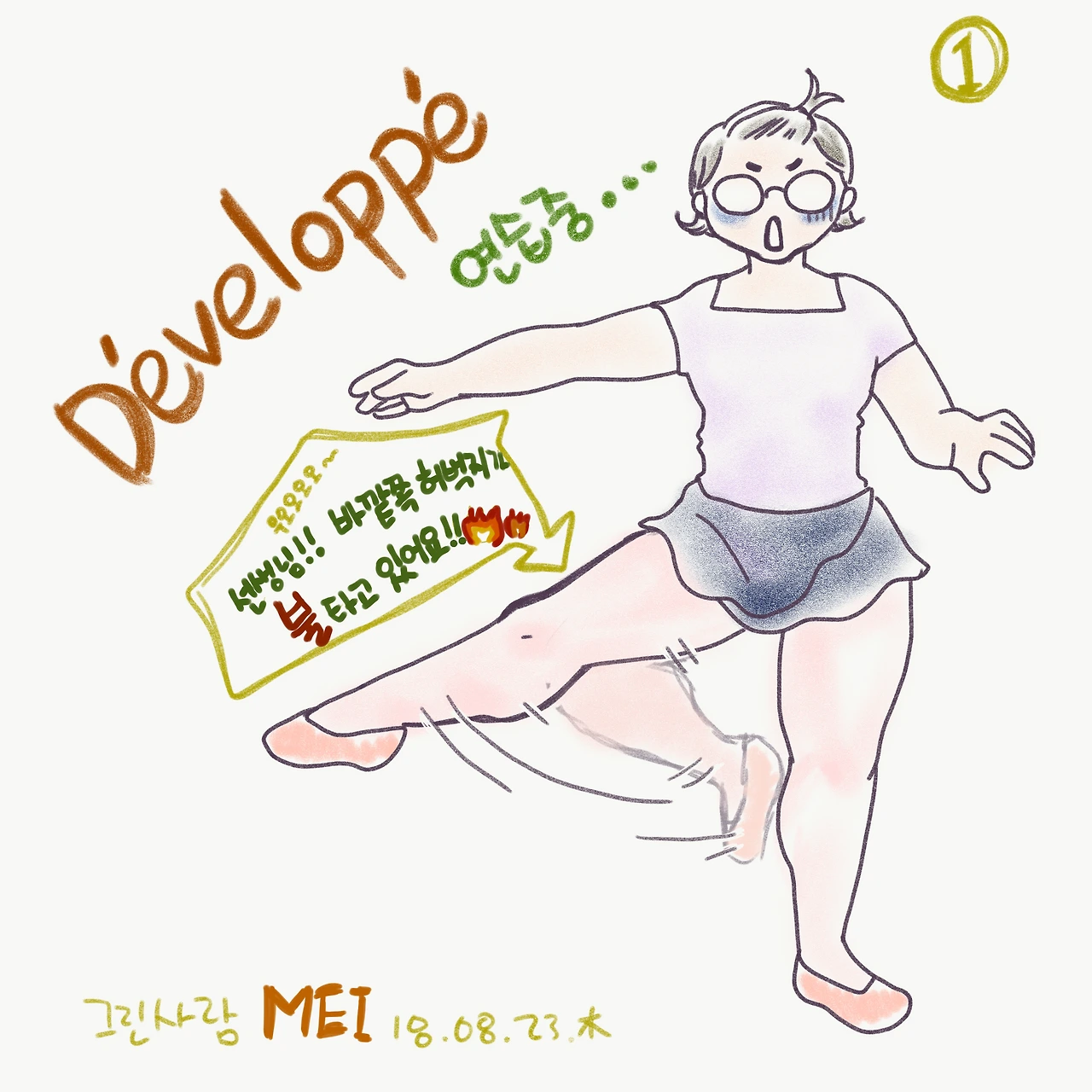 데벨로베는 무릎을 접은 상태(파세 동작)에서 펼쳐 위로 쭉 뻗는 것인데, 유연성도 근육힘도 현저히 부족한 취미발레러에겐 허벅지가 불타는 고통의 시간이다.