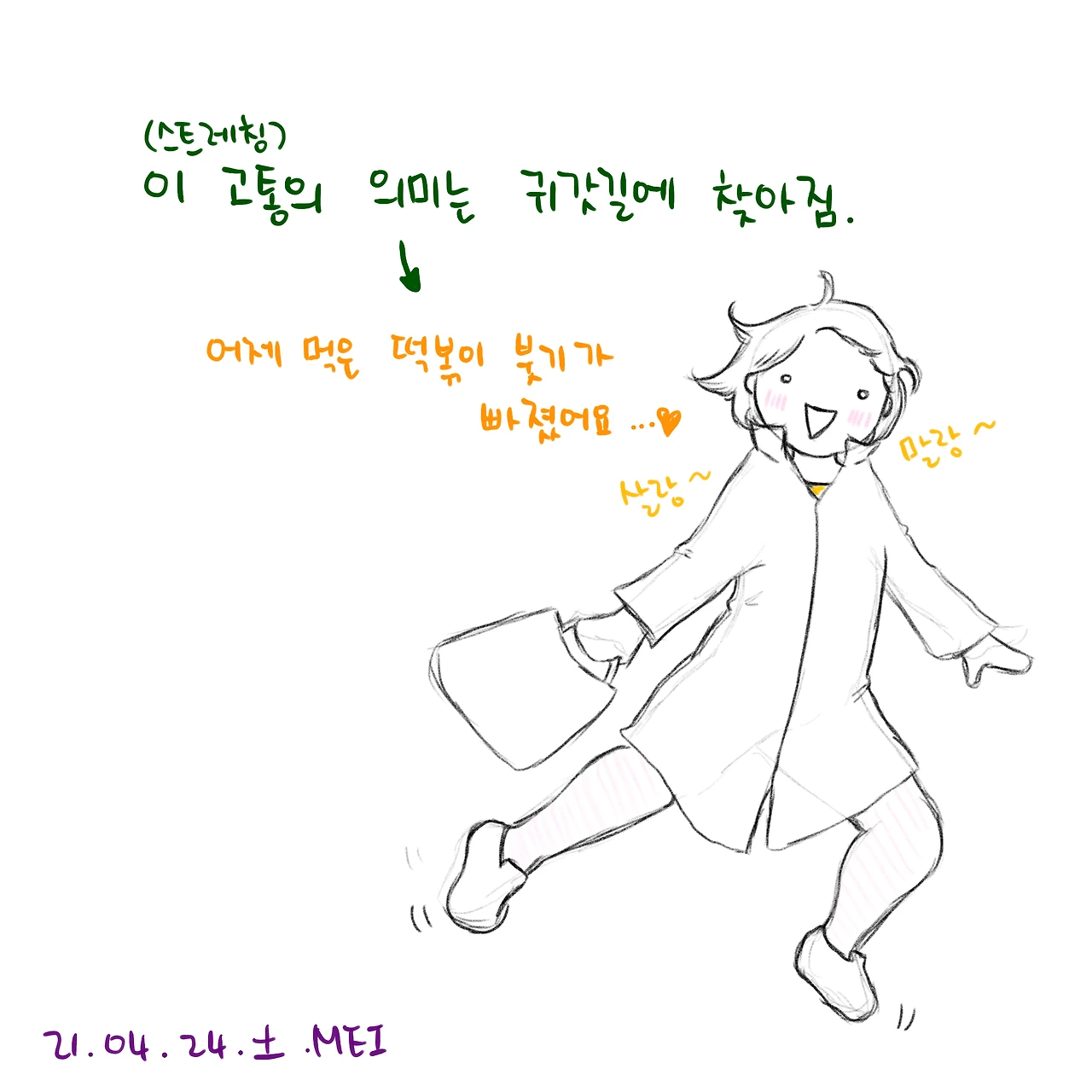 격하지만 발전 더딘 스트레칭을 마치고 나면 온 몸이 말랑말랑 해지는 느낌이긴 하다.