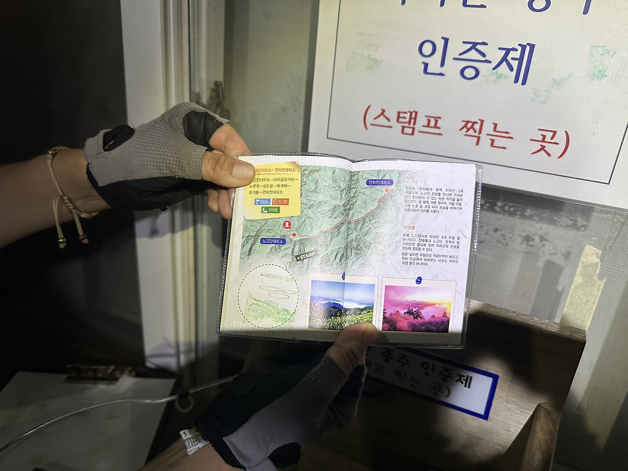 노고단 고개에서 지리산 종주 수첩 인증 도장을 찍을 수 있다.