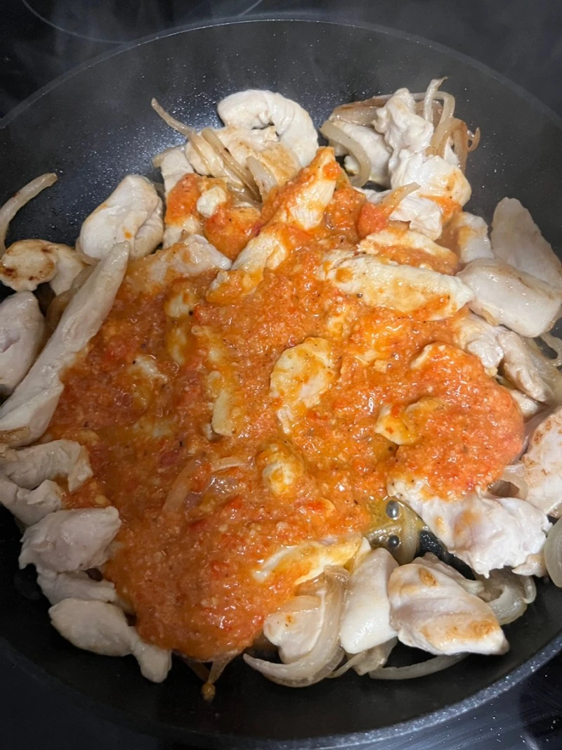 양파기름에 닭가슴살을 잘 익혀준 다음,