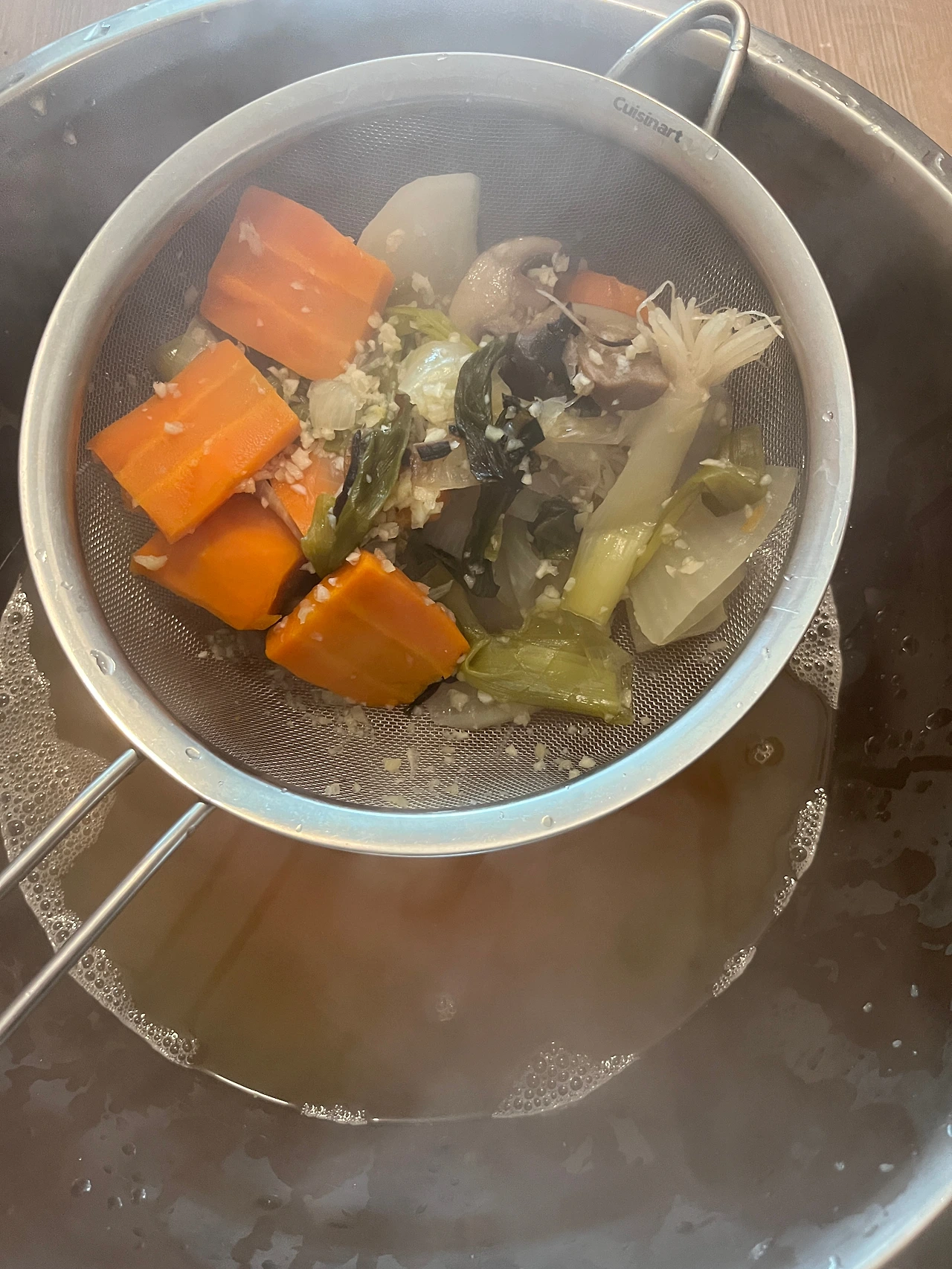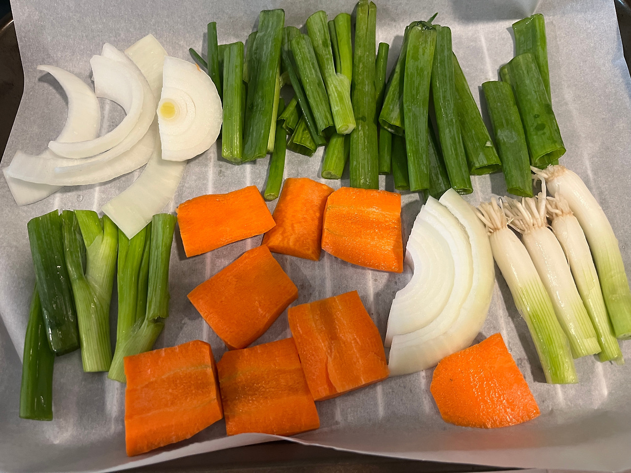 무와 다시마를 약불에 우린 물에, 구운 야채 + 마늘 + 생강 넣고 20분간 팔팔 끓이기