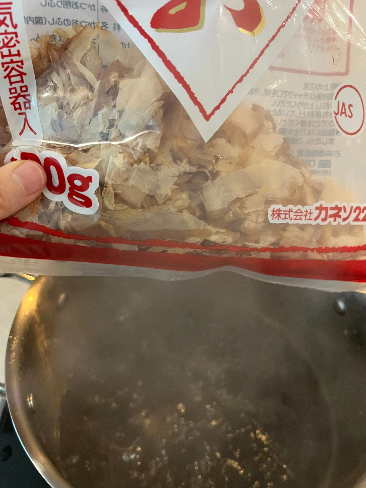끓으면 약불로 줄이고 가쓰오부시 넣어 2분간 저어준 뒤, 다시 맑게 걸러내기
