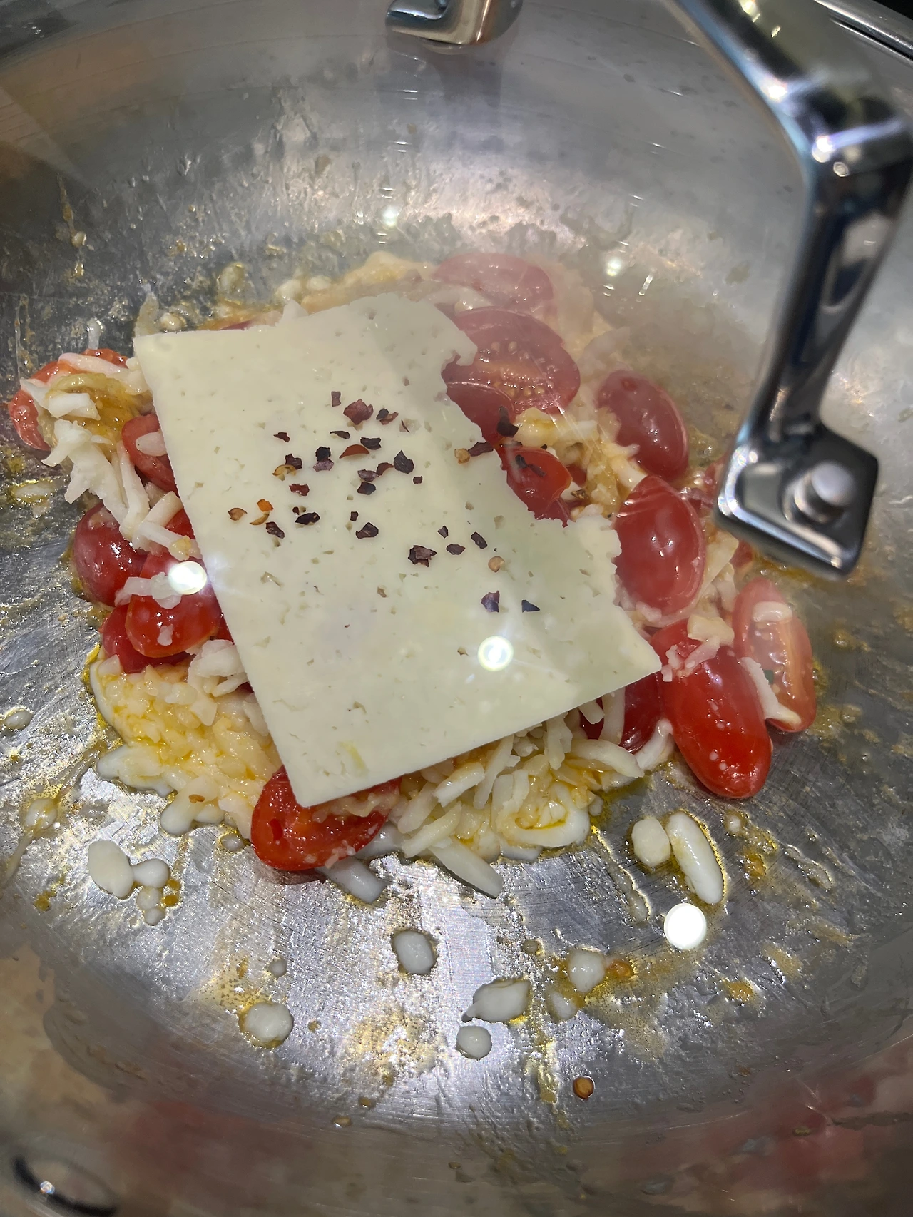 4.. 야채가 익으면 모짜렐라 치즈를 넉넉하게 넣고, 하바티 치즈 1/2를 올려 뚜껑 덮어 치즈를 녹인다.
