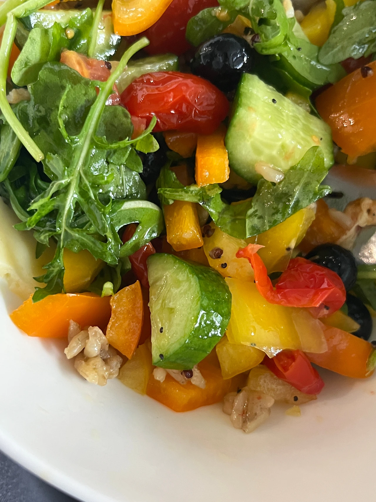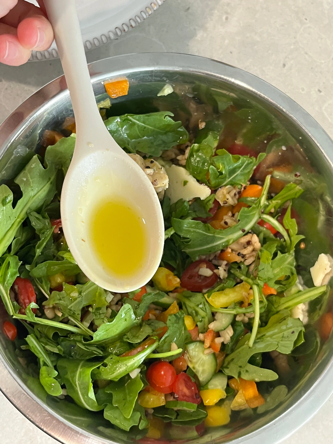 재료: 파프리카, 루꼴라(샐러드믹스), 퀴노아&현미밥, 오이, 방울토마토, 그릴드 아티초크, 치즈(하바티와 모짜렐라), 중요한 올리브오일, 버터, 페퍼론치노, 소금, 후추