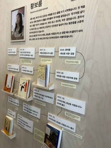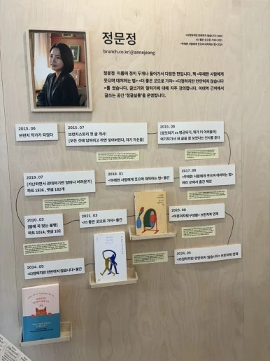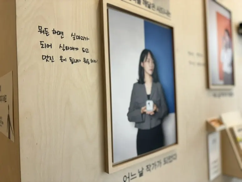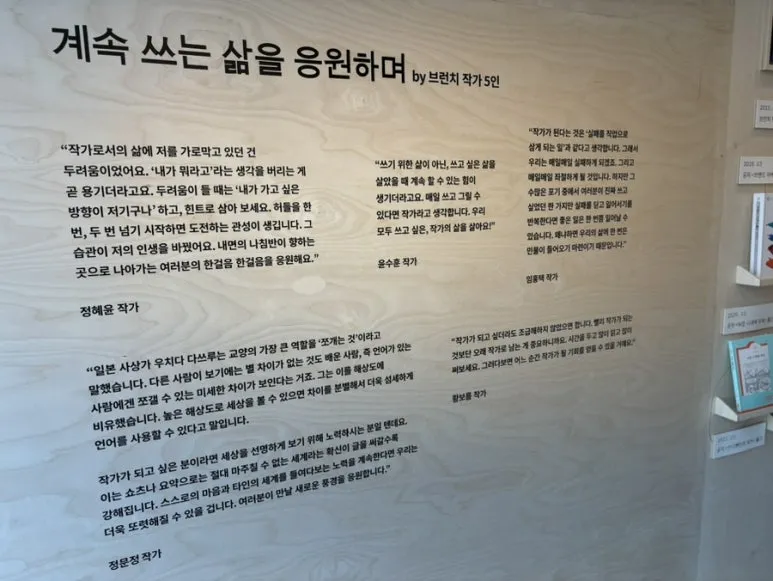 바라는 대로 된다고 믿는 내게 생생하게 목표를 그리는 것이 목표달성에 중요하다. 그래서 생생하고 구체적인 경험담은 내가 목표를 시각화하는 데에 귀한 영감을 준다. 이번 전시에서 작가로서의 여정을 자세히 볼 수 있어서 롤모델로 삼을 요소를 많이 발견할 수 있었다. 그저 일상을 진솔하게 쓴 글이었는데 많은 사람들에게 공감과 응원을 받으면서 어떤 느낌이 들었는지 이야기해 주는 저자도 있었고, 작품을 탈고까지 했는데 출판사와 계약이 불발되었을 때 POD라는 대안을 찾은 과정, 내 글에 대해 여러 사람들이 댓글로 논쟁하는 걸 보는 마음, 우연한 인연으로 해외 번역판이 출간되는 경험 등을 이야기해 주는 저자도 있었다. 그분들의 이야기를 읽으며 든 생각은 '진솔하다'였다. 작가로서 경험한 것에 대해 길어야 한문단 정도 되는 글에서도 마치 바로 앞에서 오랜 친구와 도란도란 이야기하는 듯했다. 저자들의 스토리 앞에는 그분들이 전해주는 글쓰기 꿀팁도 곳곳에 메모지처럼 가져갈 수 있게 놓여있었다. 그리고 저자들의 소중한 물건들도 전시하고 있었다. 우수 도서로 선정되어 받은 트로피, 습작 노트, 애착 필기구, 여행 다니며 모은 수집품 등등. 작가들의 취향이 물씬 묻어나서 보고 느낄 것이 많았다. 이렇게 느낀 것을 그저 감상에만 담아두지 않고 실제로 글로 쓸 수 있도록 전시 곳곳에서 글쓰기를 격려하고 있었다. 계속 쓰는 삶을 응원하며 정문정 작가님과 윤수훈 작가님이 써주신 글이 인상 깊었다.