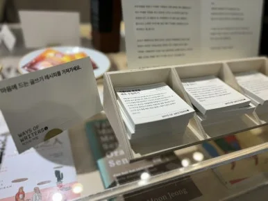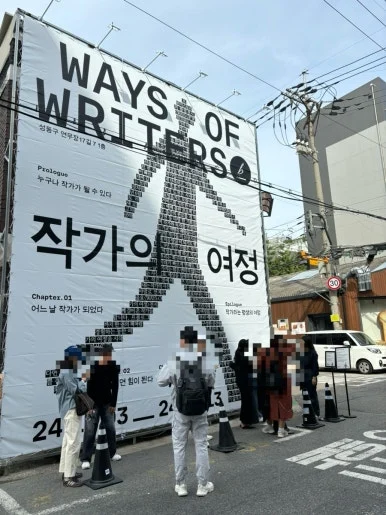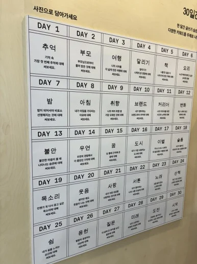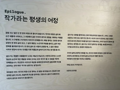 어느덧 전시의 마지막인 에필로그 섹션에 다다랐다. 글을 쓰고 싶다는 욕구로 가슴이 웅장해졌으나, 내심 무엇에 대해 써야 하나 걱정이 슬며시 올라오려던 차였다. 나의 걱정을 어떻게 알았는지 에필로그에서는 마지막으로 의지 굳히기 작전을 쓰고 있었다. 소소한 일상의 순간과 작은 깨달음 속에서 누구나 작가가 될 수 있다고, 힘주어 이야기한다. 완벽하지 않아도 된다고. 글쓰기 기술이 아니라 진솔하게 나만의 이야기를 담아내는 것이 중요하다고 응원을 해주었다. 에필로그 바로 앞에서는 친절하게도 30일간 쓸 주제를 아예 정해주었다. 그래, 핑계 댈 것 없다. 한 단어라도 좋으니 그저 매일 앉아서 쓰면 된다. 요즘 책 '아티스트 웨이'를 따라 12주 동안 창조성 워크숍을 셀프로 진행하고 있다. 두 가지가 핵심 활동인데, 바로 매일 아침 3페이지씩 쓰는 모닝페이지와 매주 한 번씩 혼자 오롯한 시간을 보내는 아티스트 데이트이다. 이제 5주차이다. 지금처럼 꾸준히 써나가면서 발견할 새로운 세상이 기대된다. 그리고 이 꾸준한 노력 끝에 작가라는 수식어가 자연스러워지길 바란다.