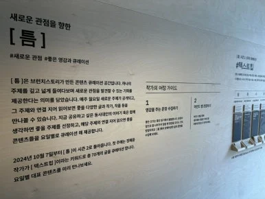 출간 작가들의 이야기 다음에는 브런치 스토리가 만든 콘텐츠 큐레이션 공간인 [틈]을 소개하고 있었다. 하나의 주제를 깊고 넓게 들여다보면서 새로운 관점을 발견하도록 돕는 것이 취지이다. 매주 새로운 주제로 다양한 글을 소개한다. 얼마 전 [틈]에 내 브런치 글도 소개되었다. 얼떨떨하기도 하고, 내 마음을 알아봐 주는 사람이 있음에 감사하기도 하고, 모자란 글이라 부끄럽기도 했다. 나의 진심이, 독자의 진심이 서로 닿을 수 있도록 글쓰기에 더 정진하라는 뜻으로 받아들였다. 거기에다 오늘 전시를 보면서 응원도 받고 롤모델들까지 발견하니 더더욱 글쓰기에 힘쓰고 싶다는 의지가 자라났다.