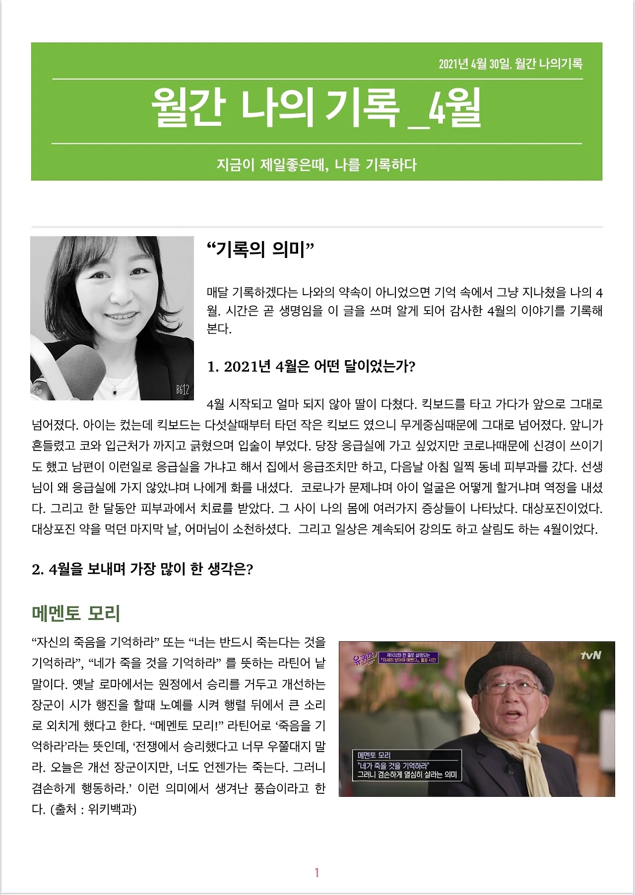매달 기록하겠다는 나와의 약속이 아니었으면 기억 속에서 그냥 지나쳤을 나의 4월. 시간은 곧 생명임을 이 글을 쓰며 알게 되어 감사한 4월의 이야기를 기록해 본다.