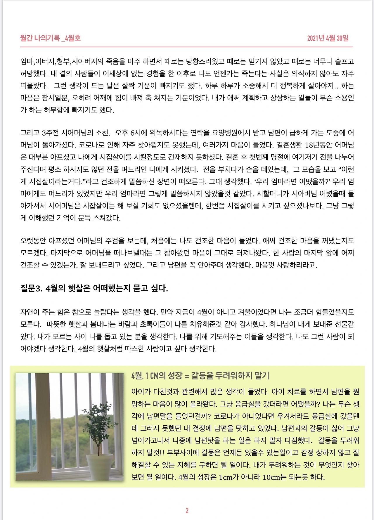 아이가 다친 것과 관련해서 많은 생각이 들었다. 아이 치료를 하면서 남편을 원망하는 마음이 많이 올라왔다. 그냥 응급실을 갔더라면 어땠을까? 나는 무슨 생각에 남편 말을 들었던 걸까? 코로나가 아니었다면 우겨서라도 응급실에 갔을 텐데 그러지 못했던 내 결정에 남편을 탓하고 있었다. 남편과의 갈등이 싫어 그냥 넘어가고 나서 나중에 남편 탓을 하는 일은 하지 말자 다짐했다. 갈등을 두려워하지 말 것!! 부부 사이에 갈등은 언제든 있을 수 있는 일이고 감정 상하지 않고 잘 해결할 수 있는 지혜를 구하면 될 일이다. 내가 두려워하는 것이 무엇인지 찾아보면 될 일이다. 4월의 성장은 1cm가 아니라 10cm는 되는 듯하다.