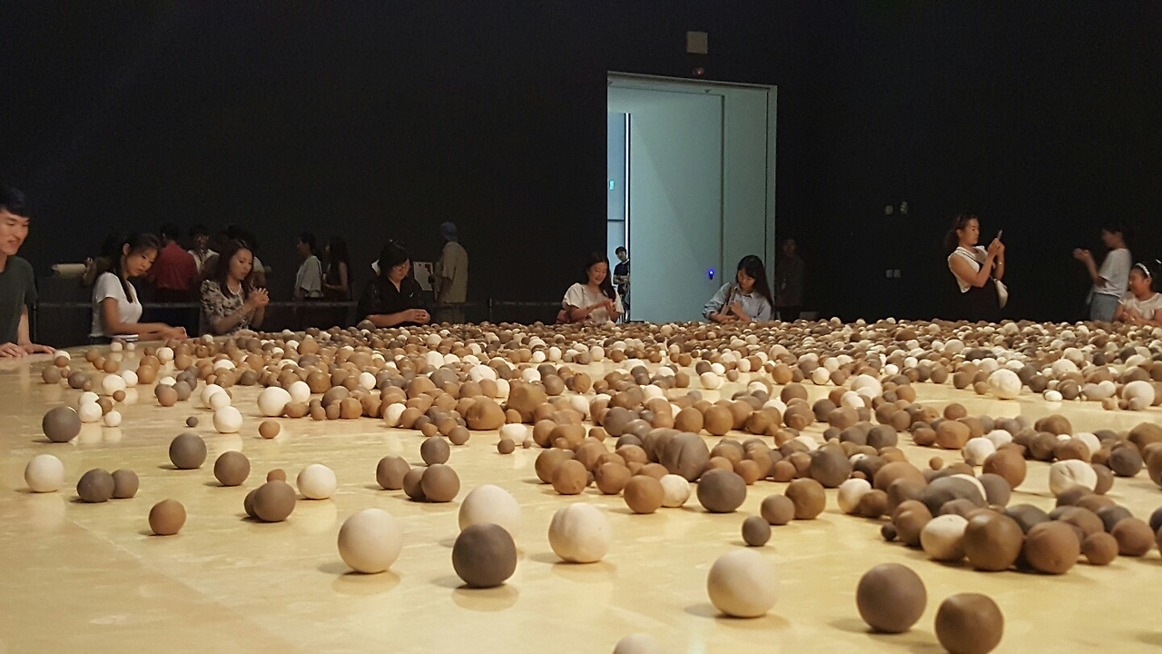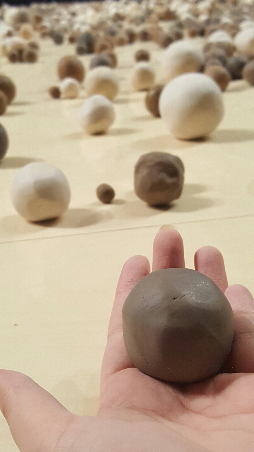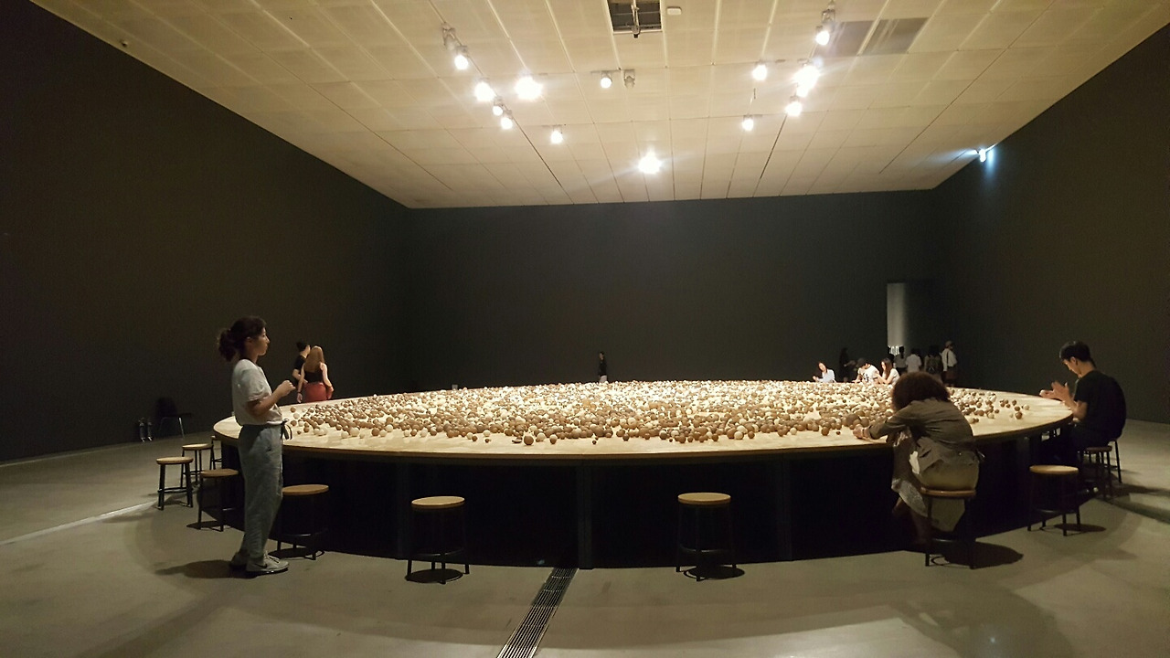 "그래, 나 같은 사람도 참여시켜 주는 작가 고마워. 근데 이거 뭐야? 뭘 말하고 싶은 거야? 뭘 느끼게 하고 싶은 거야? 어머, 이 식탁 진짜 원목 같은데? 돈 많이 들었겠네. 이 동글이 흙덩이들 내년까지 계속 쌓이면 어떻게 되는 거야? 에잇, 그냥 동그랗게 말고 별 모양으로 만들어버릴까? "