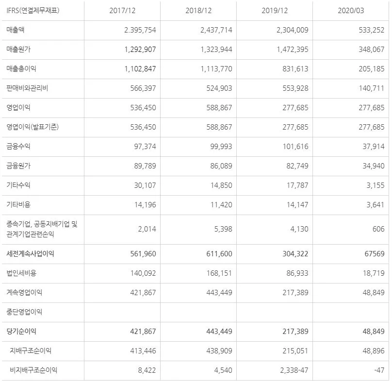 올해 1분기는 코로나 19로 인해 타격을 입었음에도 불구하고 전년 동기랑 비슷한 수준의 실적을 올리는 정말 대단한 기업이라는 것을 제무재표를 보고 알 수 있다.