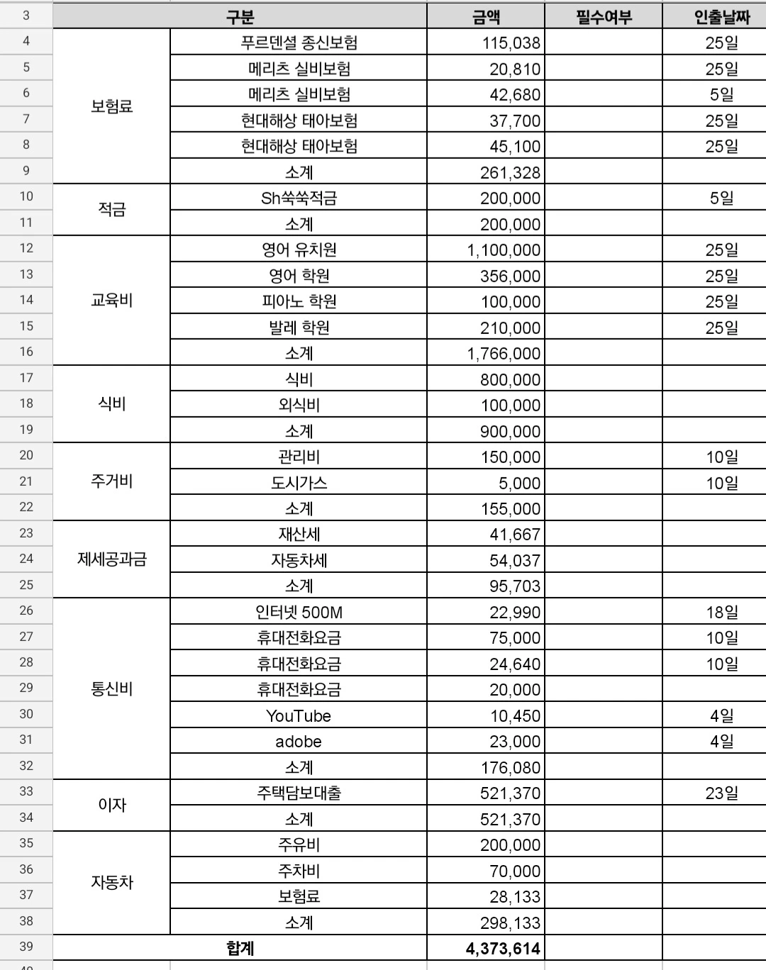 우리 집의 모든 비용은 거의 대부분 고정비 형태로 나간다.
