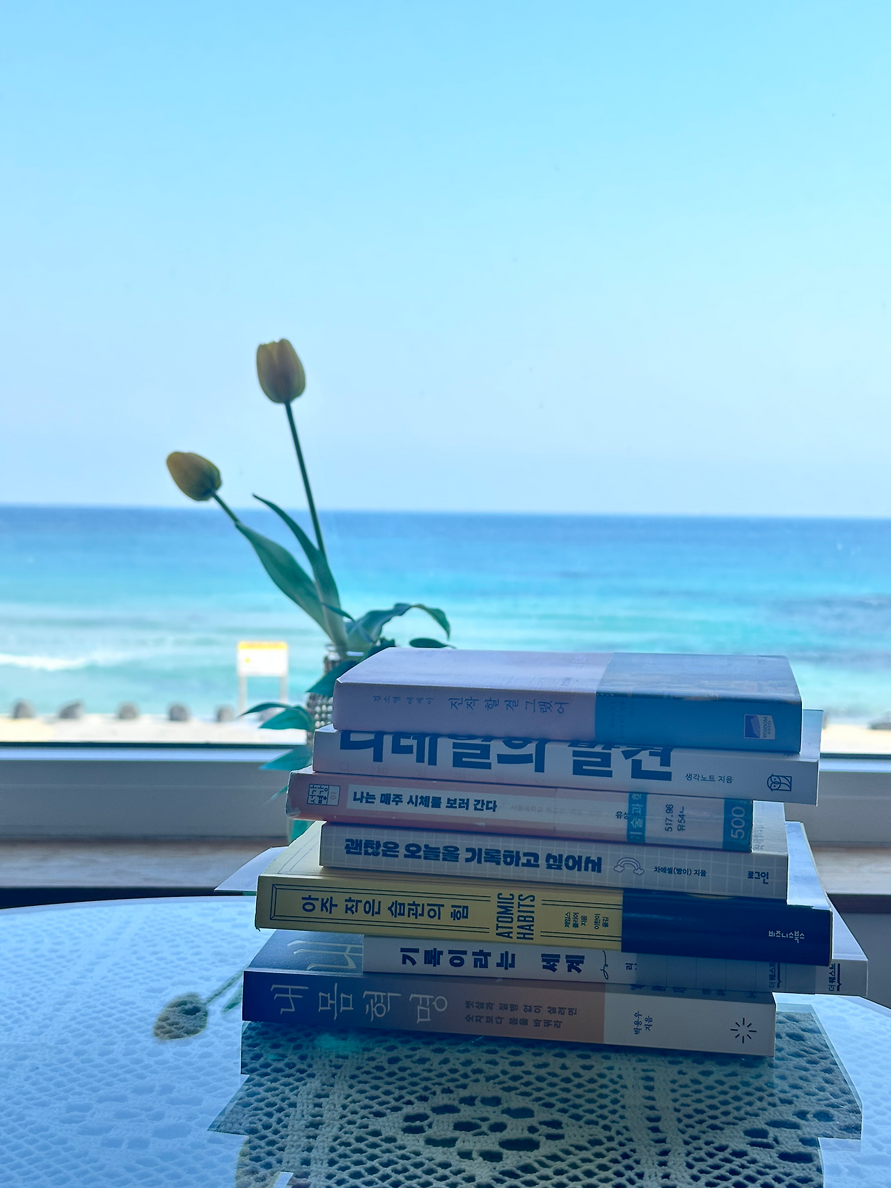 바뀌지 않는 나 자신에 답답하던 차에(내 몸과 내 마음인데 왜 내 마음대로 안될까...라고 변명해본다.) 남편과 상의하여 속세와 단절된 삶을 살아보기로 했다. 일명 디지털 디톡스 여행. 바다가 보이는 숙소를 잡아서 크게 돌아다니지 않고 바다를 보면서 다이어리도 쓰고, 책도 읽는거다. 폰은 꺼 놓은 상태로. 스무 살 이후 폰 없이 살아본 적이 없어서 어떤 느낌일지 전혀 상상이 되지 않았다. 그렇게 책 7권을 눌러담은 캐리어를 끌고 제주도로 향했다. 그래도 치앙마이 때 혼자 한 번 떠났더니 이번에는 혼자 비행기 타는 게 덜 무서워진 게 느껴졌다.
