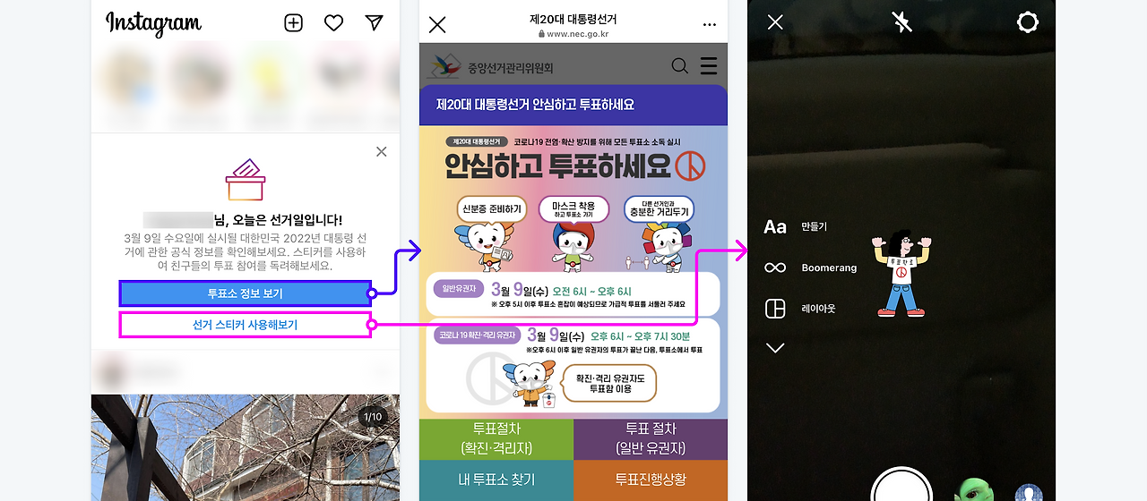 인스타그램 스토리는 즉시성을 강하게 띤다. 따라서 이벤트나 사회적 이슈가 있을 때 표현하고 퍼트리기 좋은 수단이 된다. 인스타그램은 대선을 맞이해 스토리로 투표 인증을 할 수 있도록 선거 스티커를 제공했다. 손에 투표도장을 찍어 인증하는 사람들의 패턴을 활용해 스토리로 투표할 것을 리마인드해주는 캠페인 역할을 수행한 것이다.