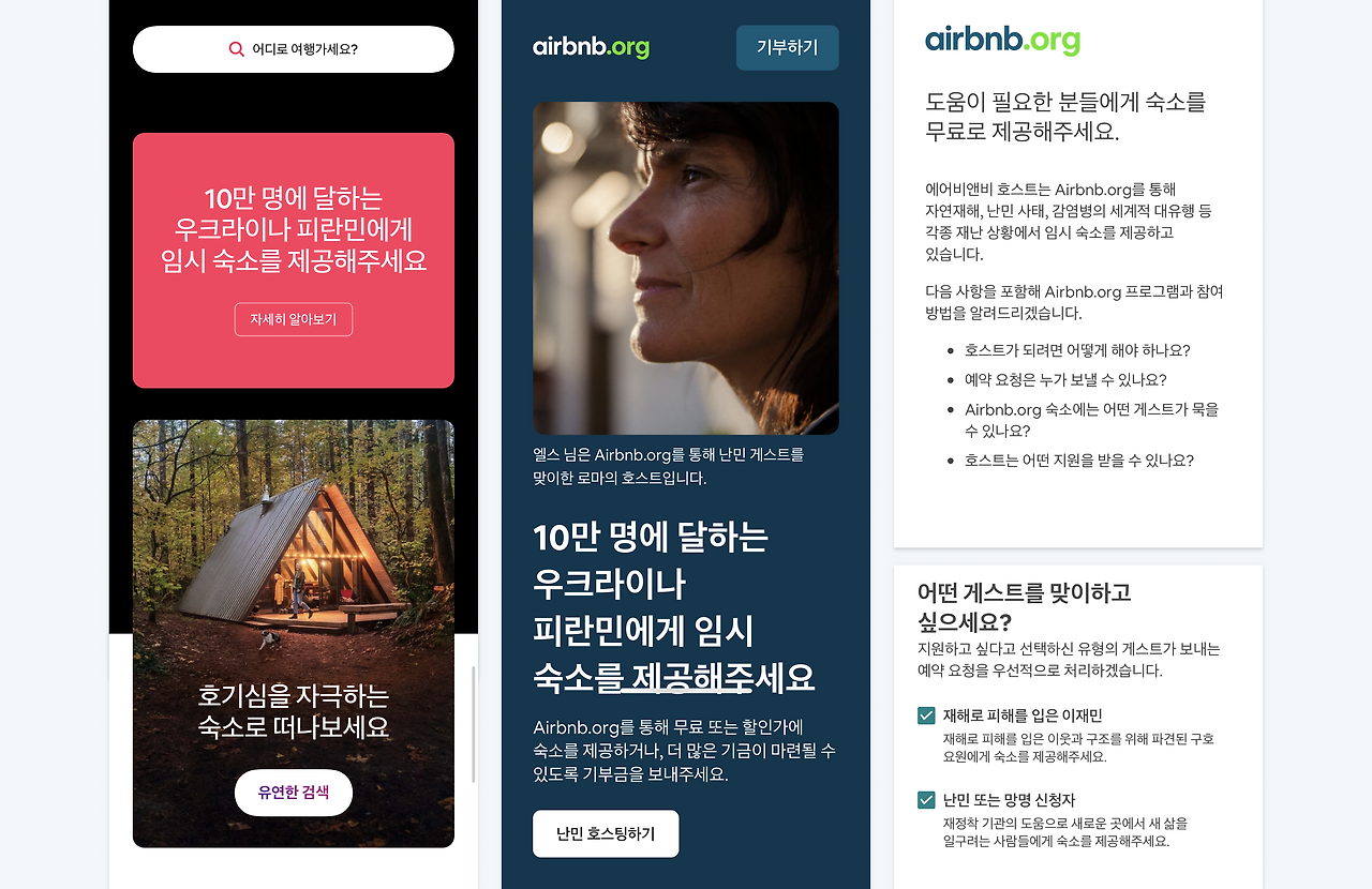 숙박 공유 서비스인 에어비앤비는 자신의 서비스를 적극적으로 활용해 재난 상황에 숙소를 제공한다. 허리케인같은 천재지변으로 피해를 입은 지역주민을 위해, 난민을 위해, 구호 인력을 위해 방을 내어줄 호스트를 찾아준다. 최근의 에어비앤비 홈 화면 가장 상단에는 우크라이나 피란민을 위한 배너가 고정되어있다. 사용자가 놓칠 수 없게 화면의 절반을 차지한 넓은 배너는 텍스트만으로 강하게 호소하고 있음을 볼 수 있다.