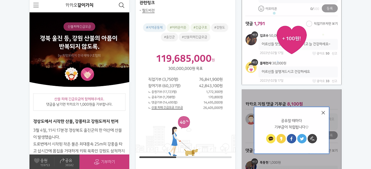 우크라이나 긴급 구호나 산불 피해 긴급 모금의 경우 댓글을 남길 경우 카카오에서 1,000원을 기부한다고 한다고 하니, 아래 링크를 타고 가서 보탬이 되어주는 것은 어떨까?