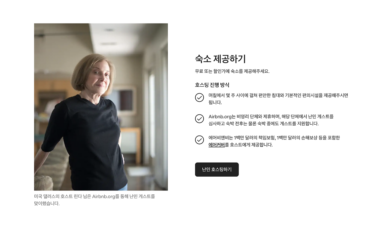 본래 에어비앤비는 일반 사용자를 위한 게스트 모드와 숙소를 제공하는 측의 호스트 모드를 분리해 인터페이스를 제공하는데, 해당 배너는 예외적으로 게스트 모드에서 제공해 최대한 많은 사용자의 동참을 구한다. 그에 따라 숙소 등록도 상세 페이지의 난민 호스팅하기 버튼을 누르면 바로 진행할 수 있도록 플로우로 이어주고 있다.