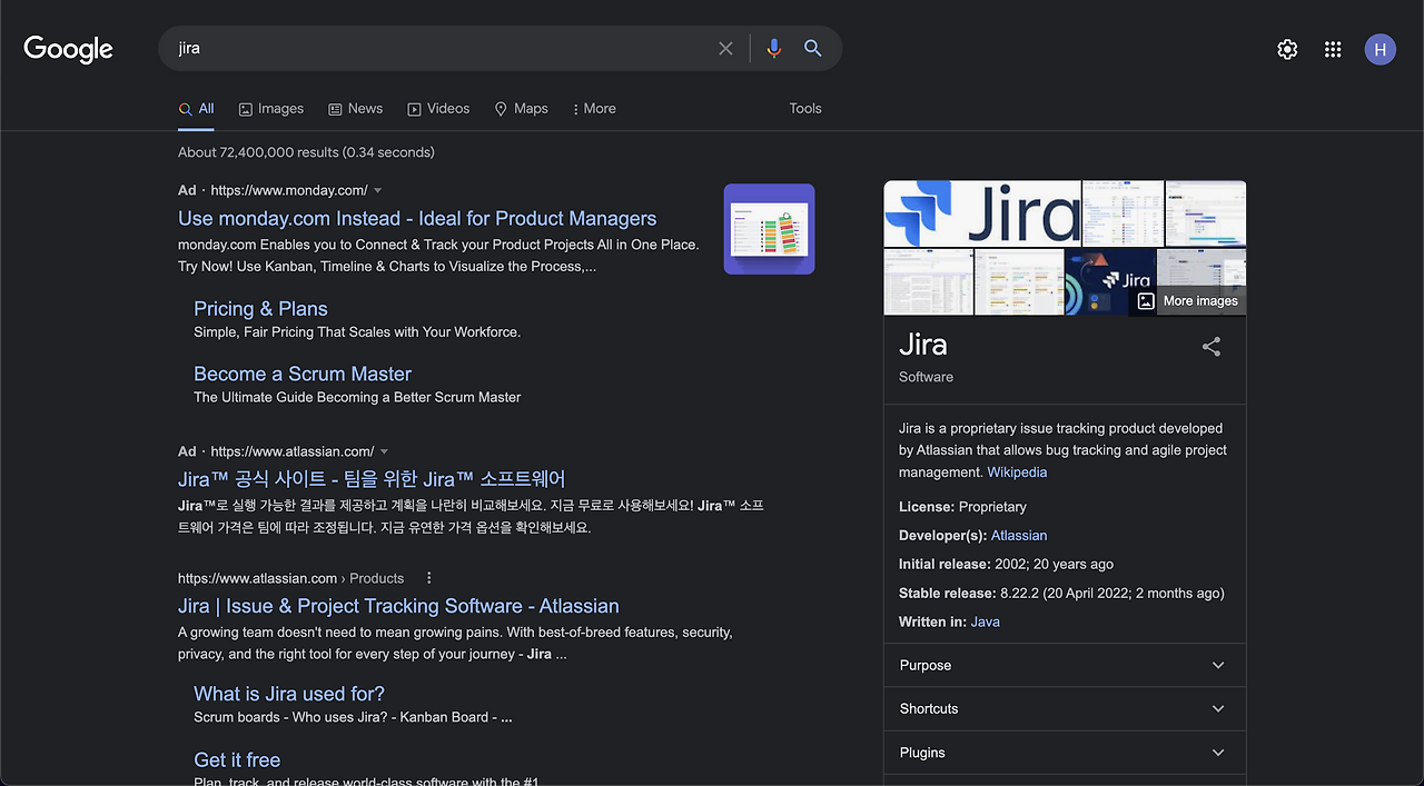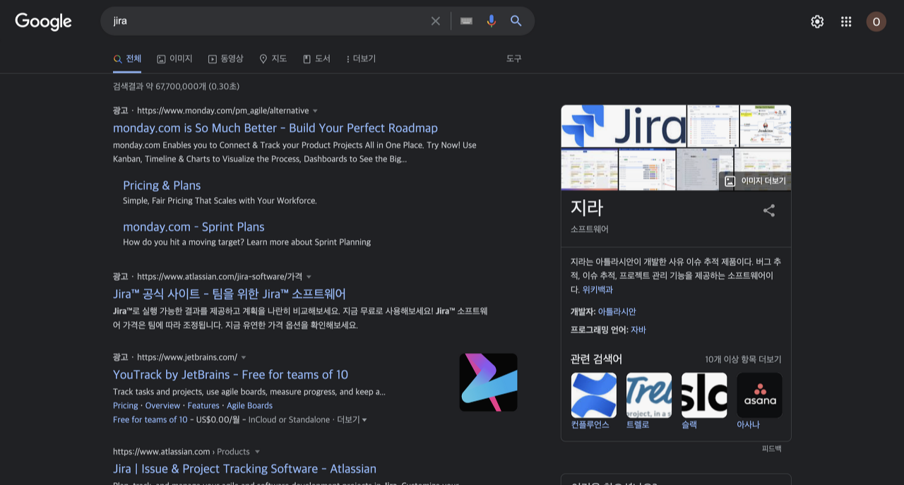 지라를 검색했을 때 맨 처음에 뜨는 광고 링크 문장을 보고 피식 웃음이 나서 공유한다.