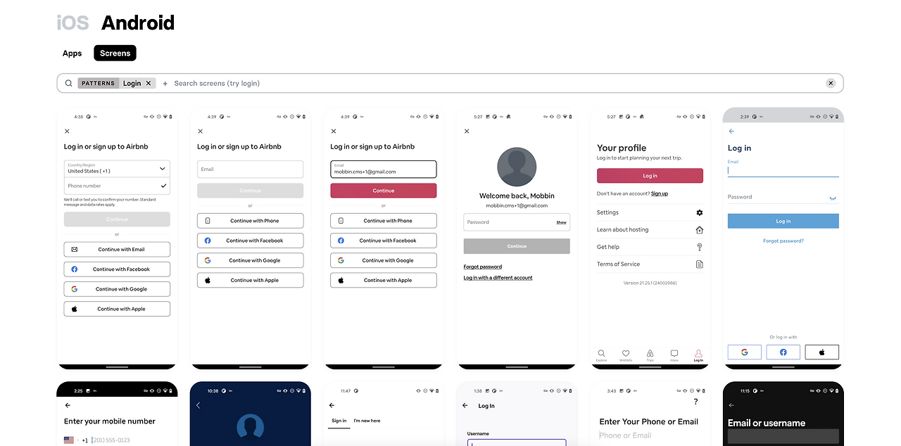 모빈은 데스크 리서치로 화면 분석할 때 빼놓을 수 없는 사이트다. 에어비앤비, 스포티파이를 포함한 유명한 해외 모바일 서비스의 스크린샷이 무려 5만 장 이상 정리되어있다고 한다. 앱의 카테고리, 디자인 패턴, 컴포넌트 별로 필터 검색이 가능해서 필요한 스크린을 빨리 수집할 수 있다는 장점이 있다. iOS 화면만 지원했었는데, 얼마 전부터 iOS와 안드로이드를 구분해서 제공하고 있다.