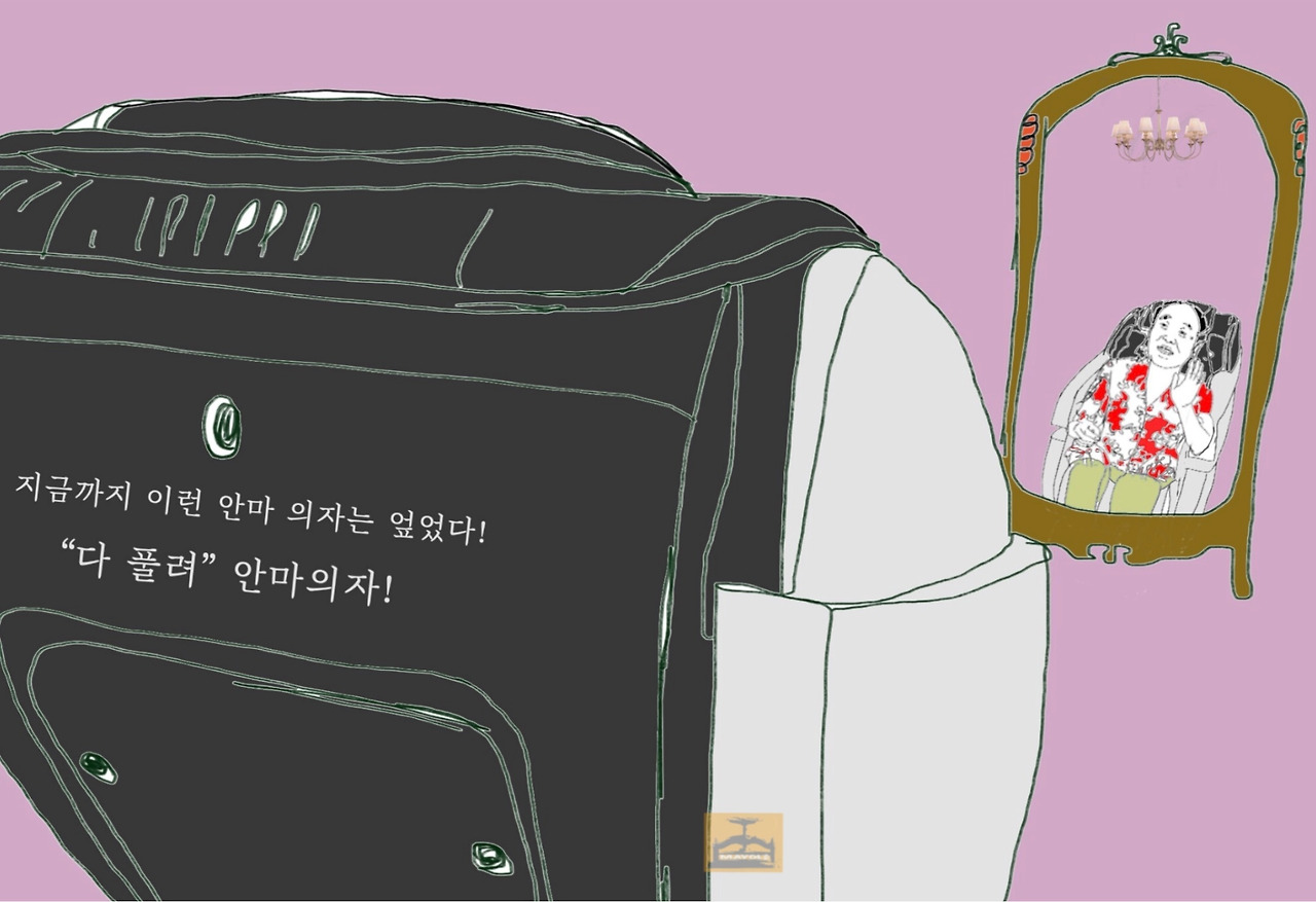 현관문을 열고 거실에 들어서자 거실 중앙에는 말로만 듣던 ‘다 풀려 안마 의자’가 떡하니 자리를 잡고 있었다.