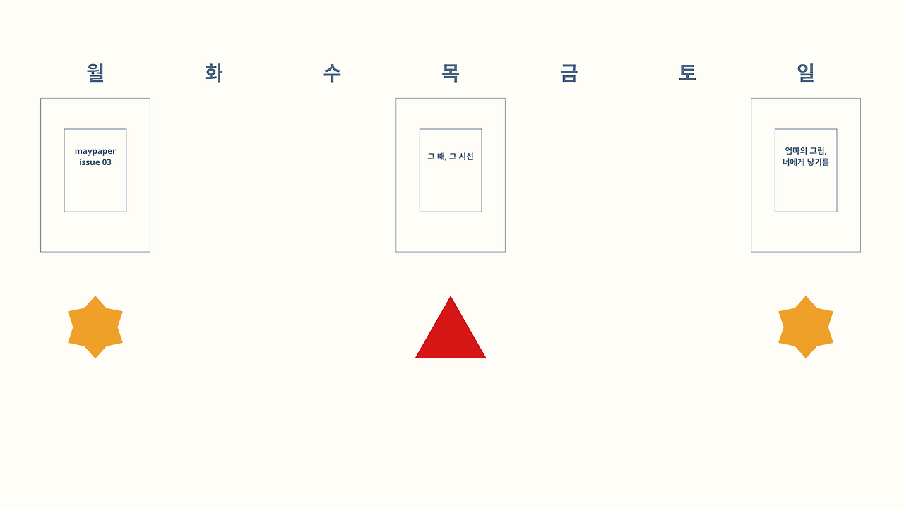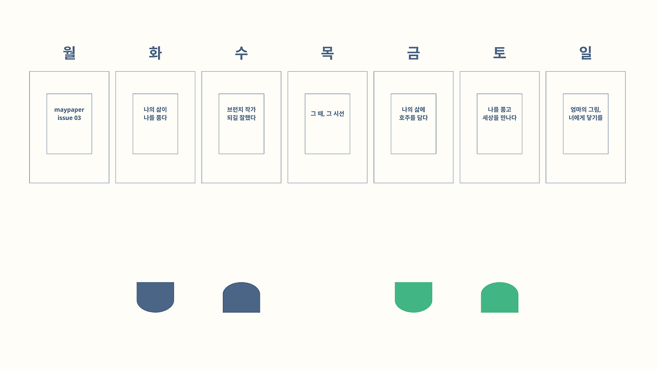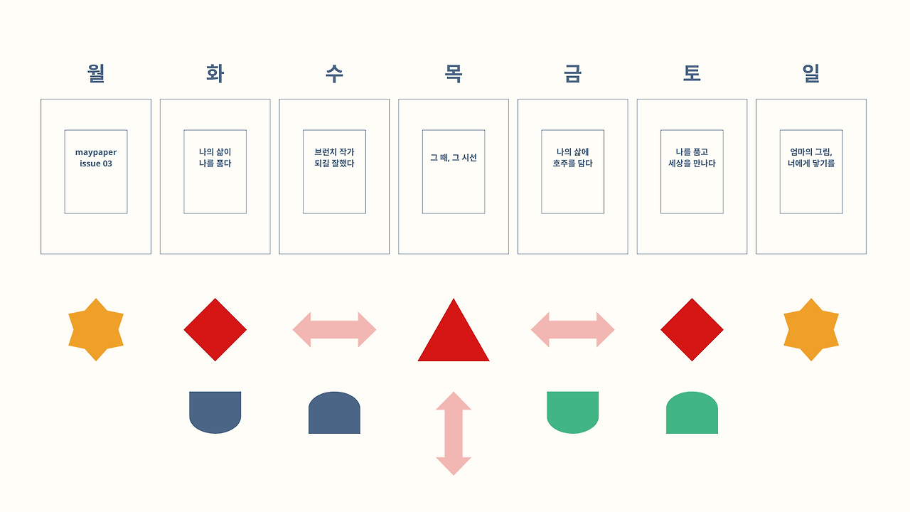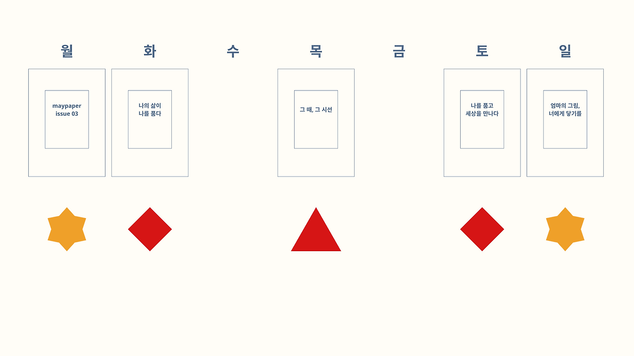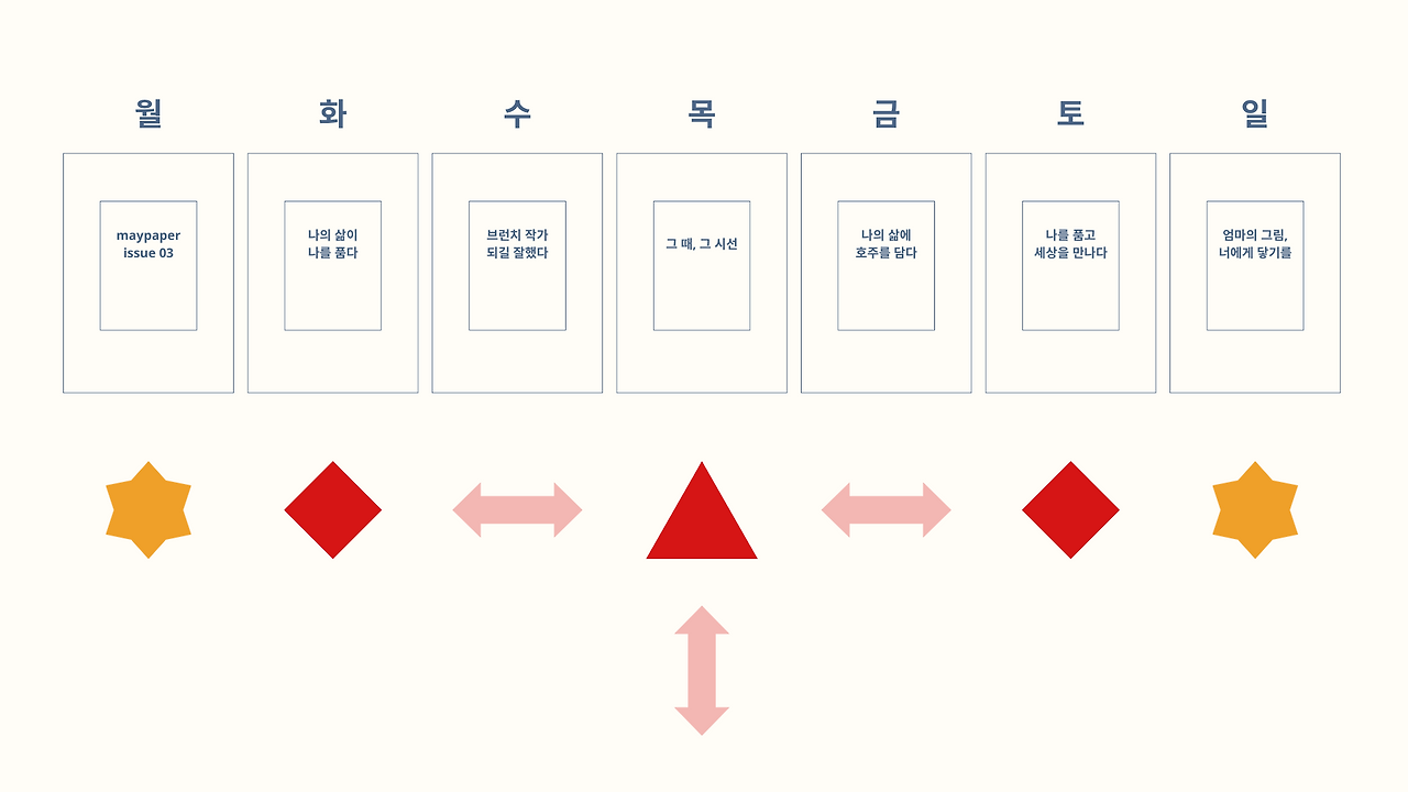 월요일 : 일주일의 시작은 maypaper - theMe 잡지로 열린다. 이것은 2025년 한 해 동안 진행하는 나만의 특별한 프로젝트이다. 매달 새로운 주제를 선정하여 그 의미를 깊이 탐구하고 나만의 시선으로 재해석하는 시간을 가진다. 이번 3월의 주제는 자연스럽게 <나의 삶을 도슨트하다>로 정해졌다.