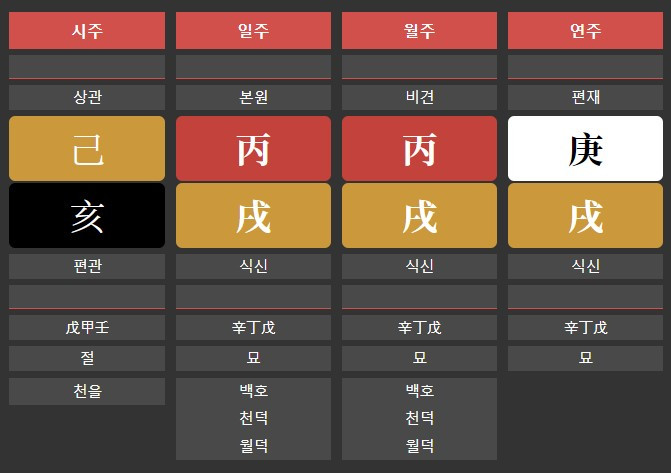딱 봐도 화 비겁과 토 식상의 기운이 강해서 건조한 느낌마저 든다. 천간에 병화가 두 개나 있다. 원래 태양은 하나여야 하는데 저렇게 쌍으로 뜨면 불길한 거 아닐까? 지지는 술토가 세 개나 나란히 있어 그야말로 마르고 광활한 벌판에 외롭게 서 있는 셈이다. 화기운은 저 많은 토기운을 생하느라 진이 다 빠져 비실대고 있다. 시지에 있는 수기운은 토기운에 갇혀서 힘도 못 쓰고 쪼그라들고 있다. 나에게 수 관성은 남자, 남편을 가리키는데, 이렇게 기운이 없으니 어떻게 하지? 결혼을 늦게 하면 좋다고요? 게다가 말로만 듣던 무시무시한 백호살이 두 개나 있다. 사고수가 있는 살이라고 하던데 운전도 하지 말고 집에 꼼짝않고 있어야 할까보다.
